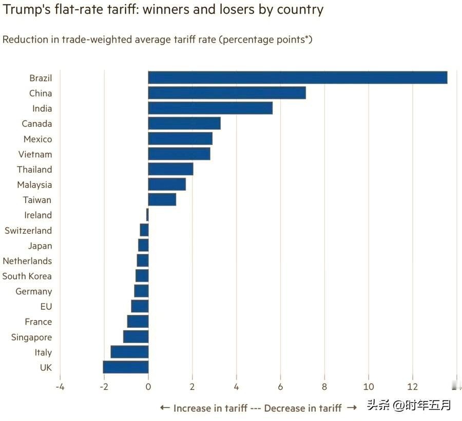 《金融时报》,巴西和中国将从特朗普的关税政策中获益最多。然而,这两个国家恰恰是特朗普批评最多、并威胁要加征巨额关税的国家。 如今,统一税率为15%,它们反而会成为最大的受益者。 例如,巴西的平均关税税率将下降13.6个百分点,中国则下降7.1个百分点。而美国盟友——英国、欧盟和日本——将首当其冲地遭受冲击。 …彭博社的也差不多评介。