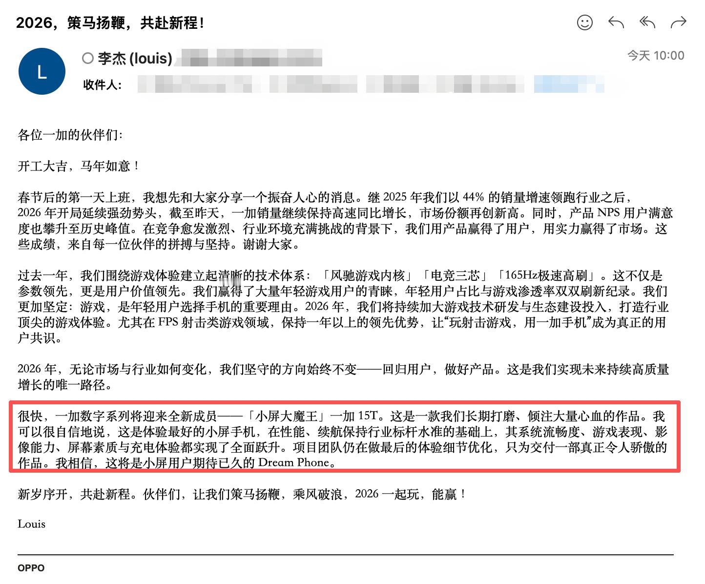 加上一加中国区总裁李杰Louis的开工信信息量也不小,提到马年第一款数字系列新品一加15T,全新「小屏大魔王」,各方面线索显示这将会是一款虽小但强的产品。信中特别强调,新品性能、续航直接拉满行业标杆,屏幕、影像、充电、游戏、系统流畅度全面升级!结合开工利是暗示的“马上登场”,大概马上就会和大家正式见面了。