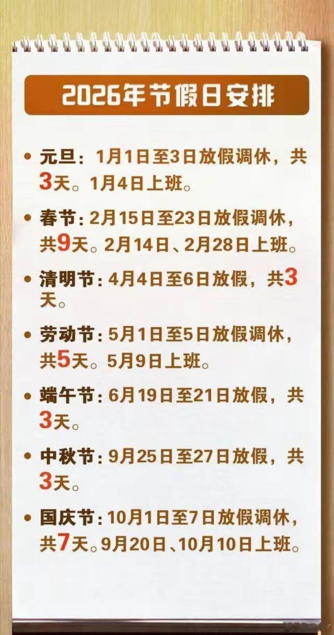 距离下个假期还有40天春节的热闹渐归平静,返程的行囊已卸下,美好的假期画上圆满句号。别因开工而惆怅,好消息已在路上:距离下一个假期,仅有40天 。2026年的清明假期,4月4日至6日连休3天,且无需调休 。这40天的耕耘,是为了春日里更从容地踏青寻柳、祭祖思源。更值得期待的是,今年劳动节、端午节等假期都与周末自然衔接,少了调休的疲惫,多了休憩的纯粹。带着团圆的暖意,怀揣40天后的约定,稳步前行吧,美好的风景永远在路上。