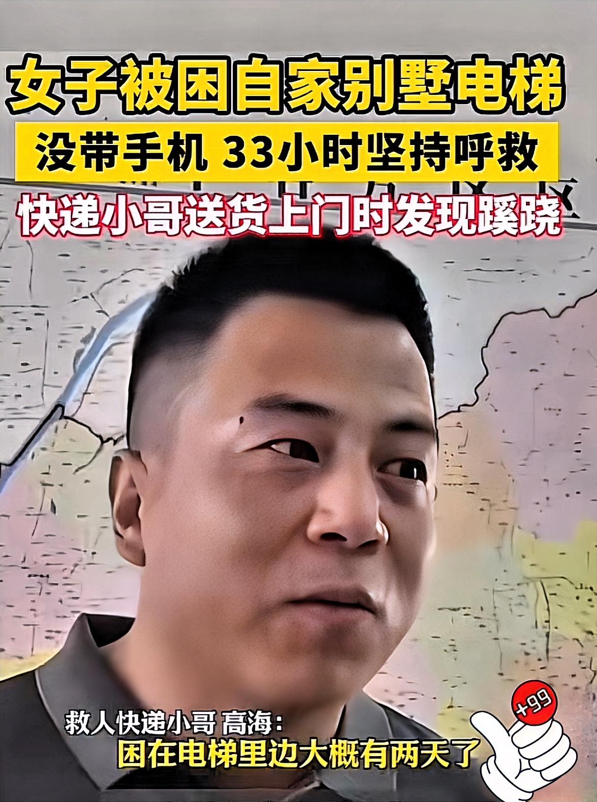 这就是命! 北京,一快递小哥,到别墅送快递,发现女主人前一天的快递还没取,打电话也无人接听。 他没有直接离开,而是走到窗前呼喊,这一喊,竟发现有人被困电梯! 这位细心的小哥叫高海。 女主人因电梯故障,卡在两层之间整整一天一夜,没带手机,无法求救,声音微弱,身体几乎透支。 高海立刻拨打110和社区电话,精准报出位置,全程冷静处置,为救援抢下黄金时间。 在救援到来前,他一直守在窗边安抚,鼓励业主保持清醒。 最终消防破拆,成功救人,女主人安然脱险,拿出重金感谢,被高海婉拒,说这只是任何人都会做的小事。 视频一发出,立刻冲上热搜,网友纷纷点赞:这才是真正的平民英雄! 常年跑片区的责任心,让他多留了一个心眼,骨子里的善良,让他在关键时刻伸出援手。 哪有什么天意,不过是藏在细节里的责任与善良,平凡的岗位,一样能做出不平凡的事。 职业不分高低,善良不分贫富, 一次留心,一次伸手,生命条一回挽能就 。 为北京快递小哥高海点赞! 平凡亦英雄,善良最动人。