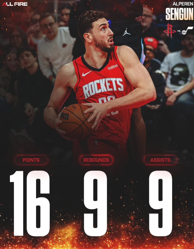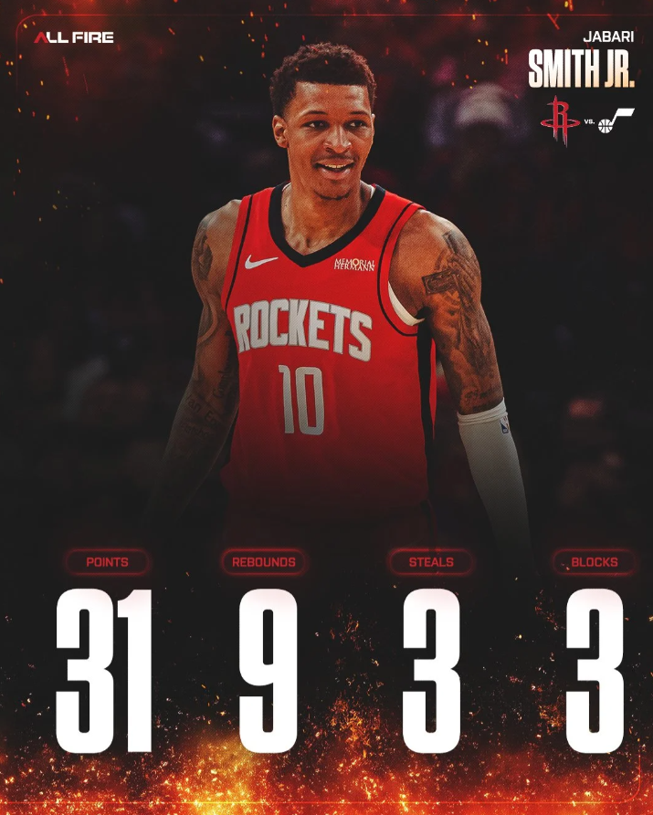 NBA常规赛火箭主场对阵爵士的比赛已经结束。全场战罢,火箭以125-105战胜爵士。 本场比赛过后,火箭战绩来到35胜21负,胜率超过掘金,排名反超掘金重回西部第三。 赛后,火箭社媒晒出首发球员的数据海报,并配文:“我们的首发球员太棒了!” 本场比赛,火箭首发5名球员合计砍下96分。
