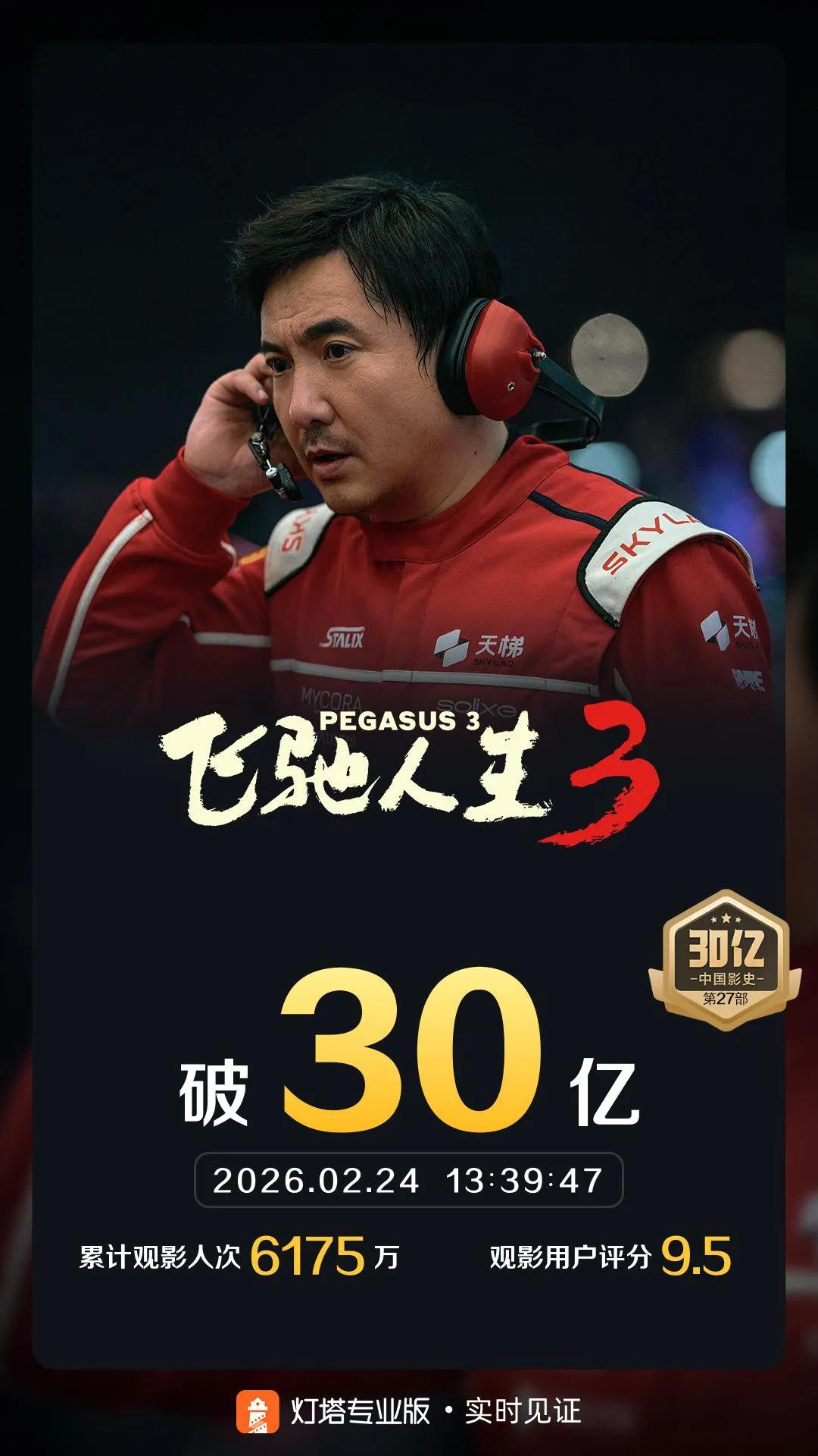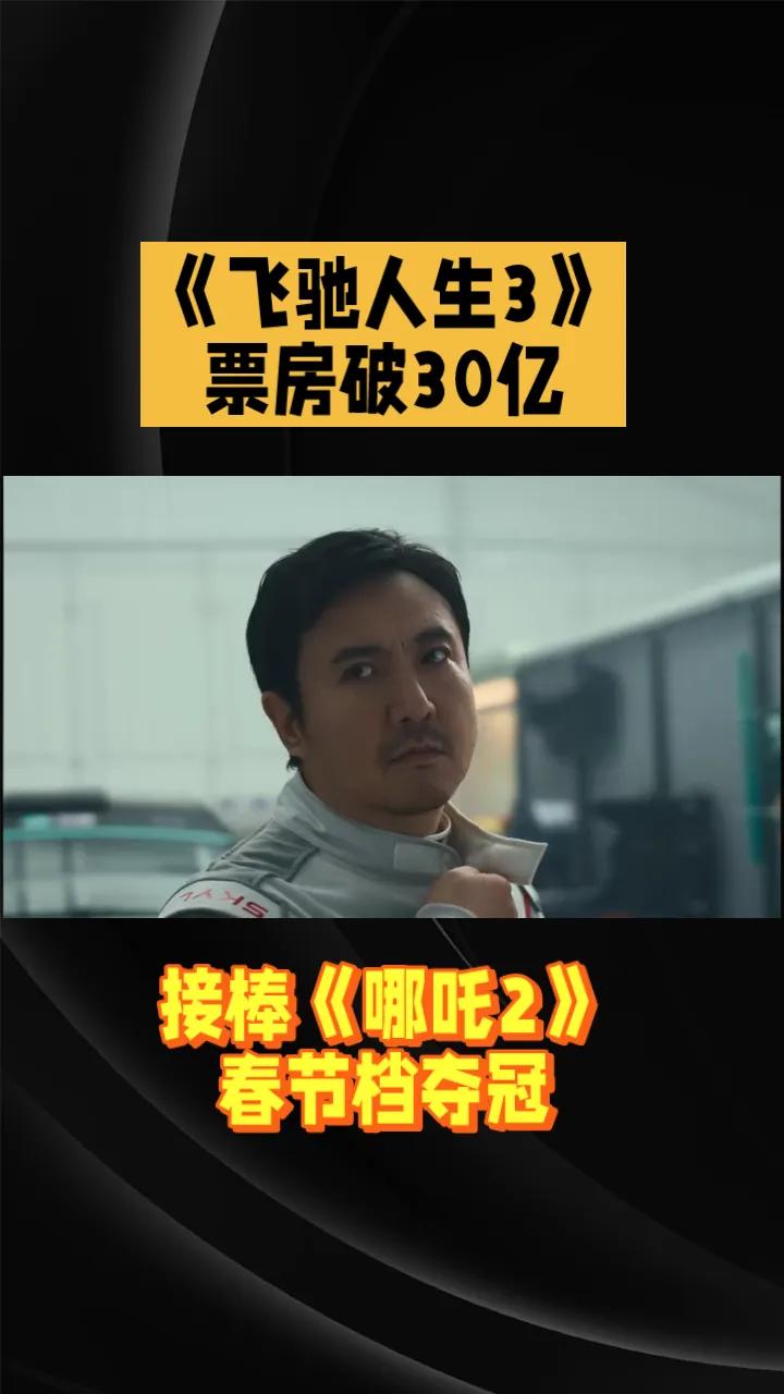 《飞驰人生3》票房破30亿,接棒《哪吒2》春节档夺冠。 由韩寒执导,沈腾、尹正、黄景瑜、张本煜领衔主演,魏翔、沙溢、范丞丞、孙艺洲主演,段奕宏特邀主演,张新成、胡先煦、李治廷、白宇帆、周政杰、高华阳特别出演,贾冰、王安宇、陈永胜、冯绍峰、郝瀚友情出演的喜剧电影《飞驰人生3》累计综合票房破30亿,是中国内地影史第27部30亿俱乐部影片。 继2025年《哪吒之魔童闹海》获得春节档票房冠军后,2026年《飞驰人生3》顺利接棒,拿下春节档冠军。不过《飞驰人生3》的最终票房预计不超过《哪吒2》的三分之一。