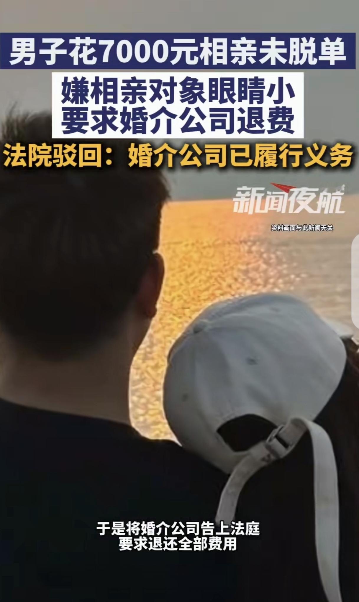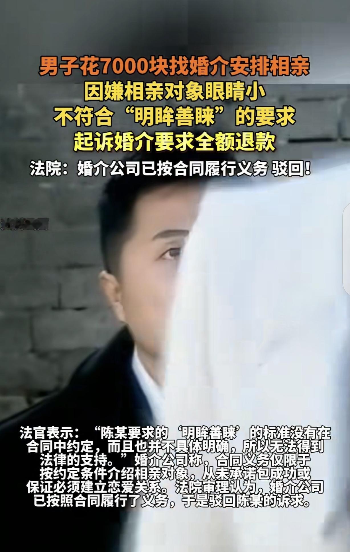 广东广州,一男子花7000元, 去婚介所找对象,婚介所给他安排2个女子见面,男子却嫌弃女子眼睛太小,不符合他“明眸善睐”的标准,要求婚介所退钱,被拒后,他愤怒的把婚介所告上法庭,法院判决让他瞬间傻眼。 陈先生一直渴望能找到合适的另一半,可自己平时工作忙,社交圈子又小,一直没遇到心仪的人。 于是,他把目光投向了婚介所,想着专业机构,能帮他快速找到理想对象。 经过一番挑选,陈先生选定了一家婚介所,还爽快地交了7000元服务费。 签完合同后,陈先生满心期待地等着婚介所给他安排合适的相亲对象。 没过几天,婚介所就通知他,已经为他找到了2位女子,跟他挺般配,条件也相当,安排了见面时间。 陈先生精心打扮了一番,早早地来到了约定的见面地点。 然而,见完面后,陈先生却一脸不悦。原来,他对女子的外貌不太满意,尤其是觉得她的眼睛太小,不符合他心中“明眸善睐”的标准。 陈先生很快就见了第二位,可还是不满意,离他心目中的标准差的不是一星半点。 陈先生恼了,连着见了2个女子,没一个看上眼的,婚介所介绍的也就那么回事,他觉得指望婚介所给自己找对象,会让他大失所望,他也没耐心再相亲下去了。 于是,陈先生找到婚介所,要求他们退钱。可婚介所的工作人员却拒绝了。 他们表示,已经按照合同约定为陈先生提供了相亲服务,安排了2位女子见面,是陈先生眼光太高,不能因为他个人主观的喜好就退钱。 而且,“明眸善睐”这种标准太模糊,没办法具体衡量,不能作为退钱的理由。 陈先生听了婚介所的解释,十分愤怒,他觉得自己花了钱却没有得到满意的服务,婚介所就是在耍赖。 一气之下,陈先生把婚介所告上了法庭,希望通过法律途径要回自己的7000元。 法庭上,陈先生据理力争,强调婚介所没有满足他的要求。 而婚介所则拿出合同,指出合同里并没有明确写明“明眸善睐”这一具体标准,他们只是承诺提供相亲服务,已经履行了义务。 经过审理,法院最终判决陈先生败诉。 法院认为,“明眸善睐”只是陈先生个人主观的审美标准,没有写进合同里,也没有一个客观、具体的衡量尺度。 婚介所按照合同安排了相亲对象,已经完成了服务内容,不存在违约行为。 陈先生拿到判决书后,瞬间傻眼了。他没想到自己因为这样一个主观的标准起诉,最后却败诉了。 这件事也提醒大家,在签订合同的时候,一定要把各项条款和标准写清楚,避免因为模糊不清而产生纠纷。 这件事里,陈先生和婚介所都没完全占理。 陈先生确实有点想当然,自己心里定了个“明眸善睐”的标准,却没提前跟婚介所白纸黑字写清楚,就跟人家收钱办事,最后又怪人家没办到,这有点不讲道理。 不过婚介所也存在问题,签合同的时候没主动把服务标准掰扯明白,可能就是想着模糊处理,多做成一单是一单。 现在很多人找婚介、买服务,都容易犯陈先生这个错,总觉得“我心里想的你应该懂”,可合同是讲白纸黑字的,没写下来的东西,真出了纠纷谁也没法说了算。 而且审美这事儿太主观了,你觉得眼睛小不好看,别人可能觉得小巧精致,根本没法有统一标准。 陈先生最后败诉也算是吃了个教训,提醒大家不管买啥服务,丑话说在前面,把要求写进合同里才是真的保险。 《民法典》第509条规定,当事人应当按照约定全面履行自己的义务。当事人应当遵循诚信原则,根据合同的性质、目的和交易习惯履行通知、协助、保密等义务。 此案例中,陈先生未将“明眸善睐”这一要求写入合同,婚介所按约提供了相亲服务,已全面履行义务,陈先生以主观审美标准主张违约,法院不予支持。 对此,你怎么看? 关注@运良说法 学法律知识不迷路