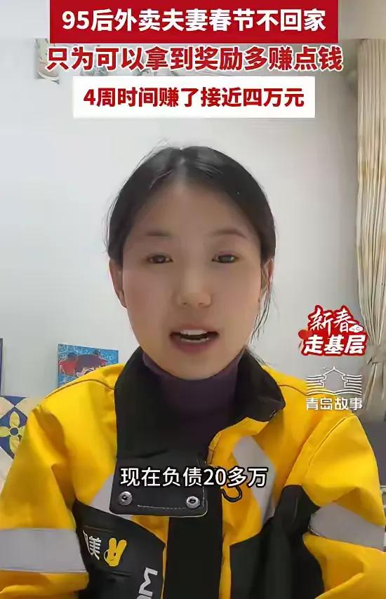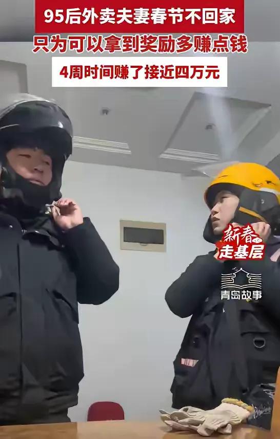 山东青岛,一对外卖夫妻过年没有回家,而是选择留下继续送外卖,4周的时间里赚了40000块钱,很多人都在讨论值不值,但妻子却认为:有遗憾,但值得! 腊月二十九的晚上,城市里已经飘起了零星的鞭炮声,家家户户的窗户里透出暖黄的灯光。这对95后夫妻却把电动车的电瓶充满,把保温箱擦得干干净净,又往兜里塞了几个暖宝宝。他们在出租屋里煮了速冻饺子,就着咸菜吃了“年夜饭”,手机里循环播放着春晚的声音,却没什么心思看,满脑子都是平台弹出的“春节跑单奖励”。 大年初一的凌晨,天还没亮,他们就出门了。街上几乎没有行人,只有零星的店铺亮着灯。第一单是给小区里的独居老人送热粥,老人接过餐的时候塞给他们一把糖。妻子攥着那把糖,鼻子一下子就酸了。那天的单量比平时多了一倍,平台的补贴也翻了倍,他们从早上六点跑到晚上十点,中间只在路边啃了两个包子,喝了几口自带的热水。 有一天下着冻雨,路面滑得厉害,丈夫的电动车在拐弯时差点滑倒,车把擦到了路边的护栏,手背上蹭掉了一大块皮。妻子心疼得直掉眼泪,要他去医院处理,他却摆摆手,从兜里掏出创可贴随便贴了贴。那天他们一直跑到后半夜,回到出租屋的时候,两个人的裤腿都结了冰碴,脱下来的时候连带着一层皮。 最熬人的是大年初三的晚上,孩子打视频电话过来,奶声奶气地问着什么,妻子强忍着眼泪回应着,挂了电话之后,她蹲在楼道里哭了好久,丈夫拍着她的背,一句话也说不出来,只是把自己的外套脱下来裹在她身上。 整个春节期间,他们每天的休息时间不超过5个小时,有时候实在困得不行,就把电动车停在路边,靠在车座上眯十几分钟。平台的奖励规则很复杂,要凑够一定的单量才能拿到最高补贴,他们就掐着时间算,哪条路线单多,哪个时间段补贴高,像打仗一样精准规划每一分钟。 到了正月二十二,他们算了算账,四周下来,加上基础配送费和各种奖励,一共赚了将近四万块。妻子把钱一笔一笔转到还款账户里,看着余额减少的数字,心里的石头终于落了地。她说,虽然没能陪孩子过年,没能给老人磕头拜年,但这四万块,是他们用汗水换来的踏实,是给家人的底气,也是对未来的盼头。 有人说他们太拼了,连年都过不好,可只有他们自己知道,当生活的重担压在肩上的时候,“团圆”两个字,有时候真的需要用汗水去换。他们不是不想家,是不敢停,也停不下来。 各位读者你们怎么看?欢迎在评论区讨论。