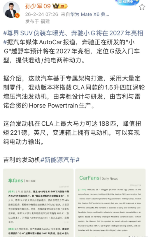 就是刚才,孙少军转发了相关的汽车博主,发出来的这个,从多个参考图片来看,目前能够看到的,就是个正经的伪装车!