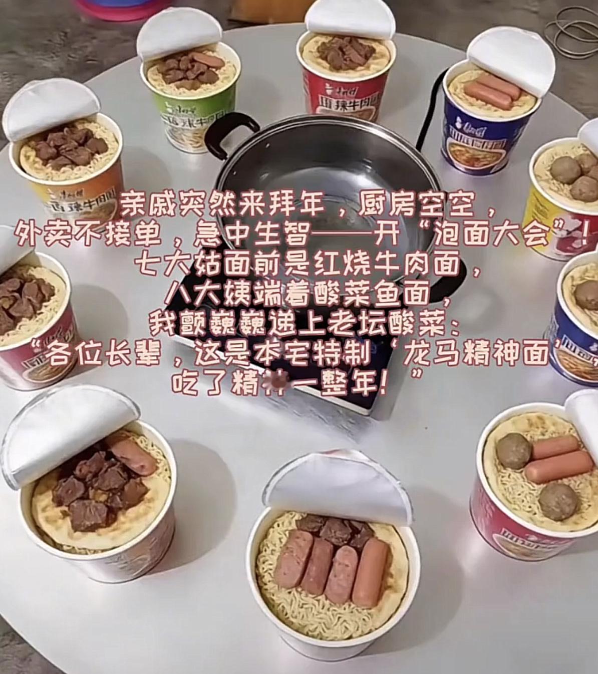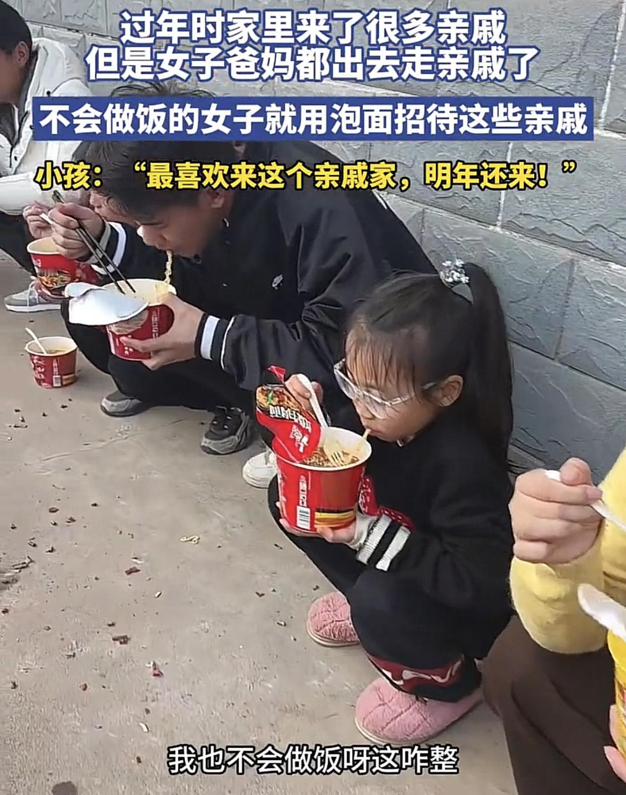 “这个值得推广!” 江西,大年初六,女生家里来了二三十个亲戚,父母走亲戚不在家。姑娘自己不会做饭,干脆到村里士多店抱回了一大箱方便面,直接用泡面招待亲戚。 这个就挺好,省时省力省心,亲戚还吃的开心,何乐不为? 年初四,我家也来了一拨亲戚,同样不会做菜我直接把人全喊到厨房,从冰箱取出食物。然后问,先放哪样?结果就是:“你出去,我们来弄!” 个个忙前跑后满头大汗干了半天上了一大桌菜,鸡胗炒竹笋,香菇牛肉,牛腩火锅,炒焖甲鱼,基围虾,螃蟹,白切鸡,蠔油生菜,结果,基本上一半都没吃。就是那一大锅米饭两天都吃不完,打扫干净人都累趴了,亲戚走后只有一声叹息,既浪费又麻烦。