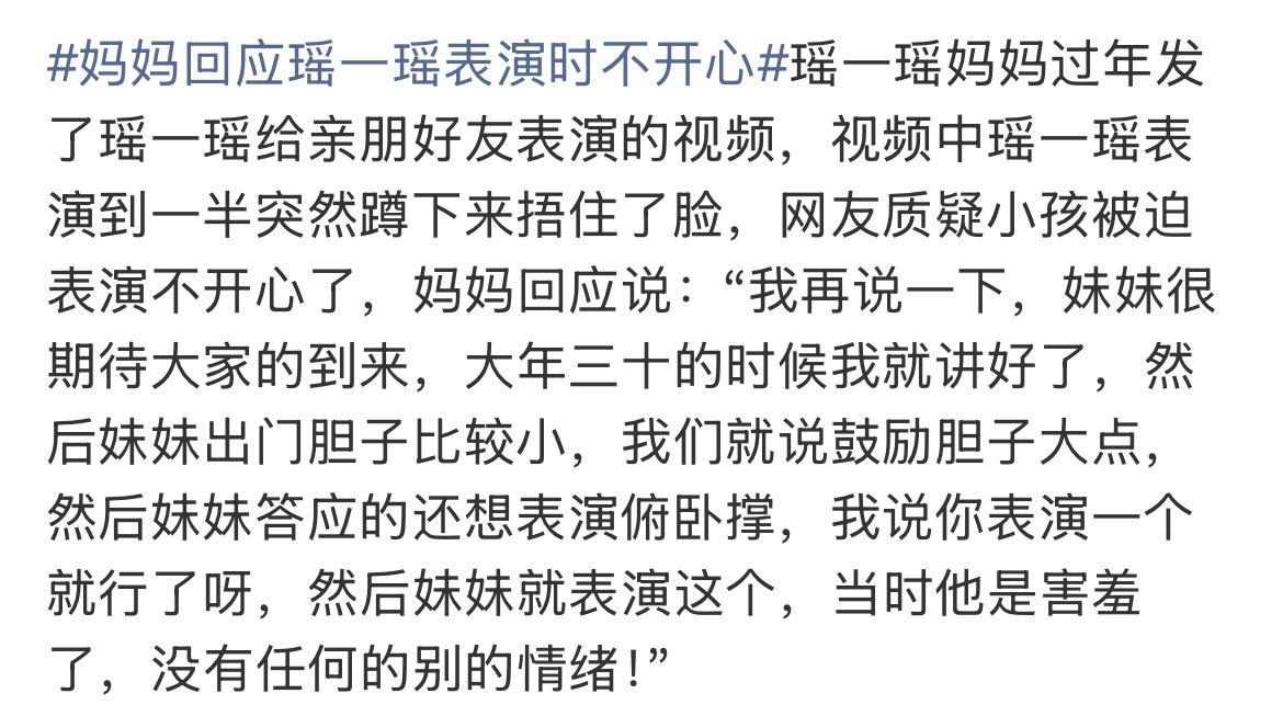 妈妈回应瑶一瑶表演时不开心之前瑶一瑶至少还是挺享受镜头的这次过年蹲下可能只是因为面对陌生的环境,又总是被亲戚起哄说到底小孩子都是喜欢鼓励的,起哄的人多少带点搞事的语气,孩子不舒服是肯定的啊