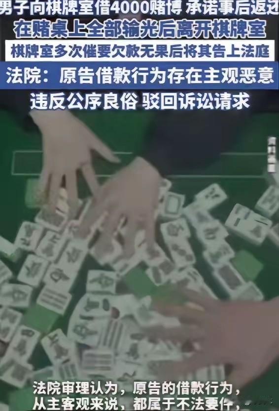 江苏,一男子在棋牌室把钱输光了,随后向棋牌室老板借了4000元继续玩,并承诺等牌打完了就还他,不料,男子在牌桌上又输了个精光,之后不但没提还钱的事,甚至还将老板拉黑,老板一气之下将男子告上法庭,并索要欠款,法院判了! 故事的主角之一,是个名叫赵强的男子。这一天,赵强像往常一样,来到了熟悉的棋牌室,准备在牌桌上“放松放松”。一开始,他的手气似乎还不错,脸上洋溢着自信的笑容。可牌局犹如变幻莫测的风云,没过多久,好运便离他而去,口袋里的钱如流水般渐渐输光。 看着空荡荡的钱包,赵强心有不甘。他的目光扫向棋牌室老板王勇,心中萌生出一个念头。思索片刻后,他走向王勇,面露难色地说道:“王老板,今天手气实在太差,您看能不能借我 4000 元,等这牌打完,我立马还您。”王勇平日里与赵强也算相熟,看着他那副急切又可怜的模样,心中有些犹豫。但毕竟在这小镇上,大家抬头不见低头见,王勇念及往日情面,最终还是把钱借给了赵强。 赵强拿着借来的 4000 元,像是抓住了救命稻草,迫不及待地又回到牌桌。他眼神中透露出一丝孤注一掷的疯狂,心里想着一定要把之前输的钱赢回来。然而,命运似乎并不打算眷顾他,牌局的走势愈发糟糕,每一把牌都像是在无情地宣告他的失败。不多时,这 4000 元也输得精光。 牌局结束后,赵强神情沮丧,他低着头,避开王勇的视线,默默地收拾东西准备离开。王勇看着他的举动,心中虽有些不悦,但还是想着赵强可能一时忘了,便没有立刻开口索要欠款。 日子一天天过去,王勇始终没有等到赵强还钱的消息。起初,他还觉得赵强可能手头紧,过段时间就会还钱。可又过了好些日子,依旧没有任何动静。王勇忍不住给赵强发消息询问,却发现自己已经被拉黑。这下,王勇彻底愤怒了,他觉得自己的信任被赵强肆意践踏。 王勇越想越气,自己好心借钱给赵强,没想到换来的却是这样的结果。在愤怒与无奈之下,他决定拿起法律的武器维护自己的权益。王勇收集好相关证据,毅然将赵强告上了法庭,并明确索要那 4000 元欠款。 法庭上,王勇详细陈述了事情的经过,出示了借钱时的相关记录等证据。而赵强,在接到法院传票后,不得不现身。他低着头,一脸懊悔,却又无言以对。面对确凿的证据,他无法抵赖。 最终,法院根据事实和相关法律规定做出了判决,判定赵强需偿还王勇 4000 元欠款。这场因棋牌室借贷引发的纠纷,至此落下帷幕。它给人们敲响了警钟,在人际交往中,诚信是基石,一旦失去,不仅会伤害他人,也会让自己陷入困境。同时,这也提醒大家,在涉及金钱往来时,要保持谨慎,用法律手段保护自己的合法权益。