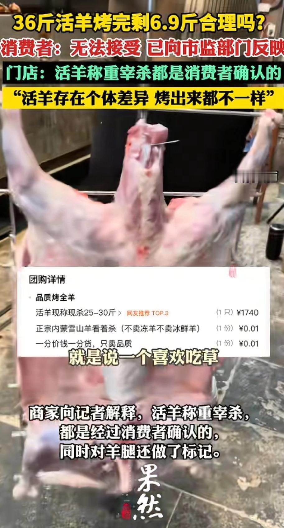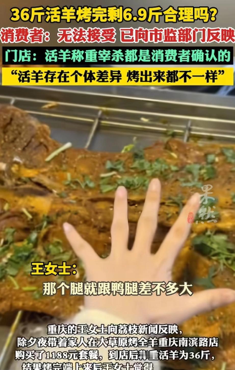 36斤活羊烤完只剩6.9斤? 除夕夜,王女士一家人去吃烤全羊,点的是活羊现烤。商家现场牵羊,当着面称好是36斤,王女士怕被掉包,还专门在羊腿上做了记号,才让商家拿去烤。 烤了一个多小时,羊端上来一看,又瘦又薄,肉很少,羊腿细得跟鸭腿差不多,之前做的记号也不见了。 王女士立刻找老板对质,双方争执不下,商家一直说这是正常损耗,不肯复称。王女士没办法,只能报警。 警察到了之后,商家才勉强把烤羊拿上去称,结果一称只有6.9斤。36斤直接缩水近30斤,损耗超过80%。 面对这个重量,商家还在解释:活羊要先宰杀、去头去蹄、去皮去内脏,本身就会轻很多;再经过长时间烤制,水分烤干,重量还会再减,还说羊的肥瘦、运动情况不一样,出肉也不一样。 烤全羊有损耗很正常,但从36斤变成6.9斤,你们觉得这个比例合理吗?美食分享