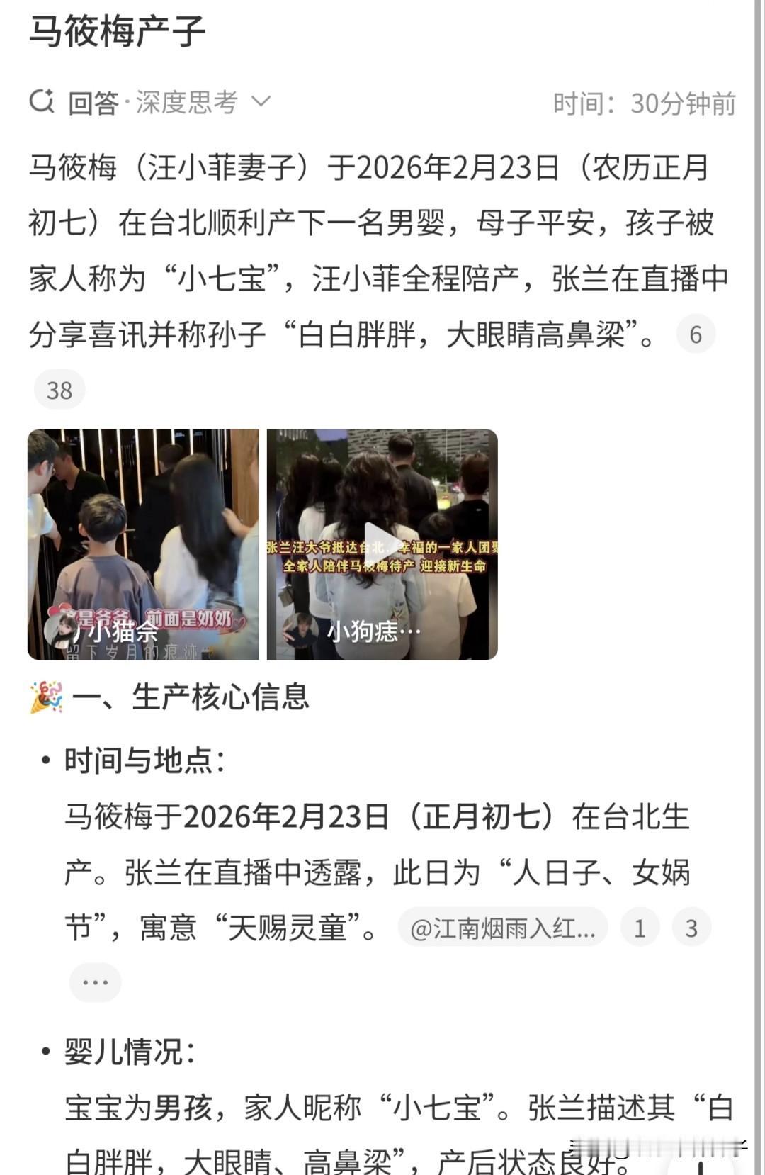 张兰官宣喜讯,马筱梅初七生了个大胖小子,汪小菲全程陪伴! 2月24日,网上晒出一段视频,张兰在直播时宣布喜讯,透露马筱梅在大年初七成功产子,汪小菲一直在产房外守护。 说实话,一开始有点难以置信,这可是大喜事,汪小菲竟然没有第一时间在网上发文庆祝,让人怀疑事情到底是真是假,后续,看到一位经常关注马筱梅的粉丝,也晒出视频,从侧面证实了喜讯。 视频中,张兰笑得乐不拢嘴,表情和肢体动作都难掩内心的喜悦,坦言小玥儿又多了一个弟弟,初七生个大胖小子,迎来一个“小马驹”,并感谢汪小菲和马筱梅,还有亲家以及老汪。 其实,这种心情可以理解,马筱梅在初七顺利生子,好争气,汪家人丁兴旺,张兰这个年纪又当奶奶了,换谁都高兴。 据悉,上个月,马筱梅回家安心待产,并且停止直播,还晒出视频透露近况,跟汪小菲一起拍写真,当时孕肚已经十分明显。 该说不说,不知道为啥,张兰说的话,总让人感觉不靠谱,希望汪小菲能够跟大家分享喜讯!