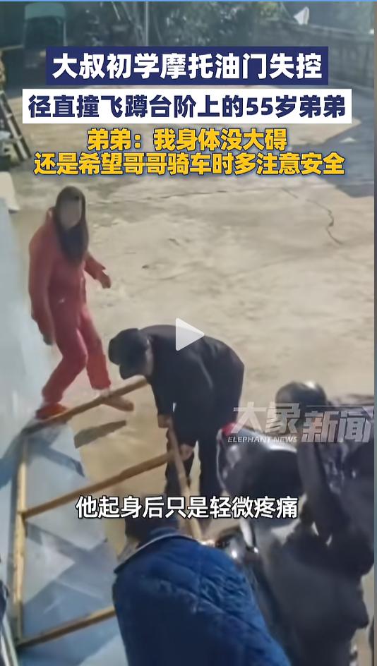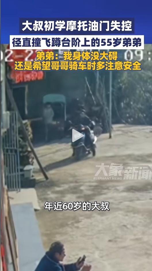 “悲伤中带着一丝好笑!”近日,湖南张家界,一60岁男子练习踏板摩托车时失误,油门突然失控,径直撞向了亲弟弟,弟弟躲闪不及,被撞倒在地,哥哥也摔在了地上。幸运的是,两人只受了点轻伤,没有大碍。网友:这么大的人了怎么还毛毛躁躁的呢! 踏板摩托车以其轻便快速的特点,备受人们喜爱。不过,因为其车速较快,骑行时还是存在一定危险性的。 据媒体2月22日报道,王大爷今年60岁了,事发当日,他正在院子里练习踏板摩托车,55岁的弟弟正蹲在屋门口的台阶上玩手机。 也不知怎的,他突然间操作失误了,油门失控,车辆快速的骑上了台阶,径直朝弟弟撞了过去,还刮拽了立在墙根的一片栏杆。 弟弟躲闪不及,被直接撞倒在地上,王大爷重心不稳也摔了下去。这时候车辆失去控制,压在了王大爷一条腿上,车后被拖拽过来的栏杆也倒在了车上。 屋里的人听到动静,赶紧跑了出来,先将王大爷和弟弟扶起来后,又分别把摩托车和栏杆来了起来。 幸运的是,王大爷和弟弟起身后,两人都只感觉到了一点轻微的伤痛,一会儿就好了,身体没有大碍。弟弟也表示,希望哥哥以后再骑车的时候多注意安全。 网友看后表示,要不是看后面你们两个这么有爱,还以为哥哥是故意撞的呢!请原谅我不厚道的笑出了声。加起来一百多岁的人了,可得稳重点! 信息来源:《2月22日湖南张家界,年近60岁大叔在院子里练习骑踏板摩托时油门失控,径直撞向正蹲台阶上的55岁弟弟!