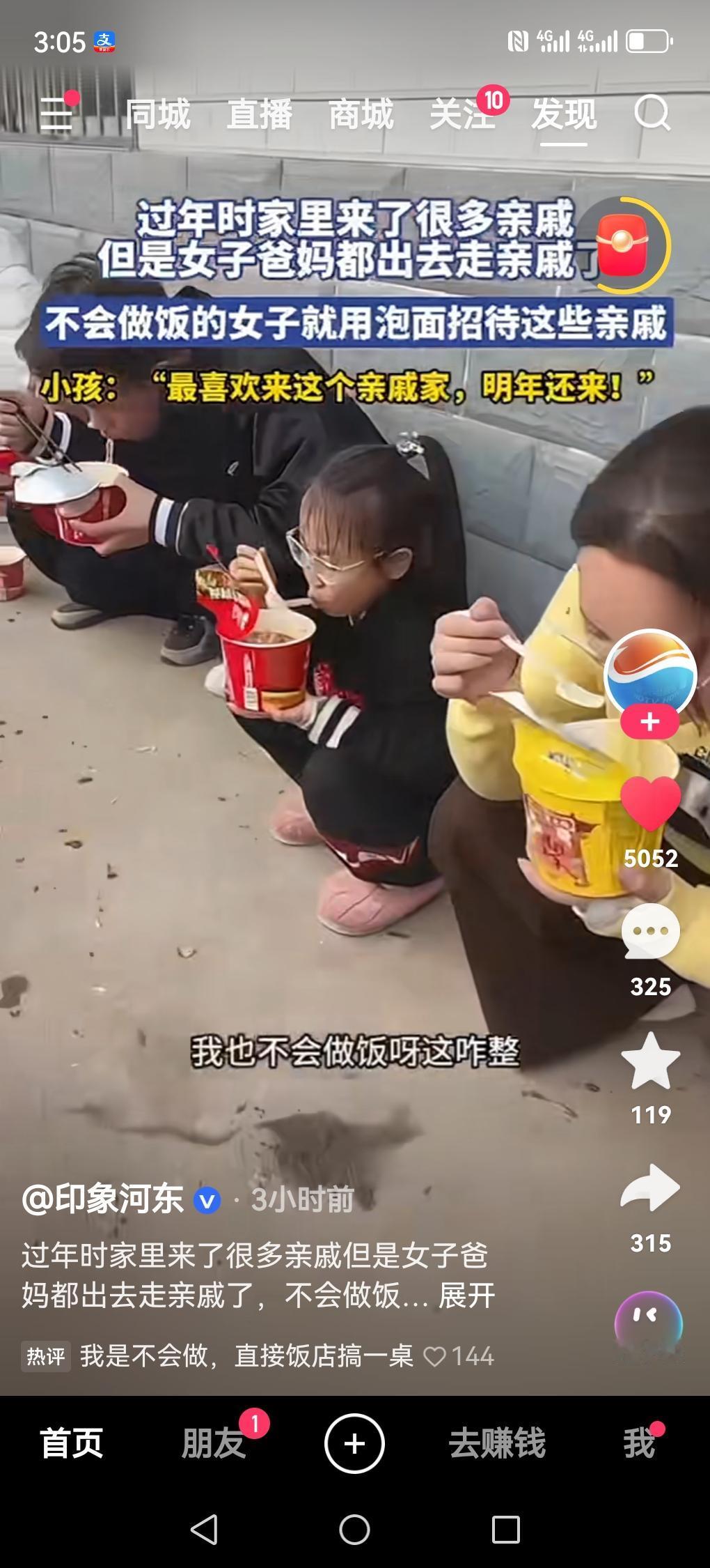 刚看到一视频,把我逗乐了。 一女子家里突然来了许多拜年的亲戚,她父母去走亲戚了,她又不会做饭。于是她给每一位亲戚一人一桶泡面,画面中每位亲戚捧着一桶泡面,蹲在墙角吃泡面,太搞笑了。确实,每年一些家庭都会有一些不提前通知来拜年的亲戚。我有一年也遇到过,好在家里有些剩菜,蒸了几个菜应付过去。不知你们遇到这种情况怎么处理的?(图片信息来源:印象河东)奇葩亲戚 过年尴尬名场面 亲戚暖心瞬间 农村亲戚拜年