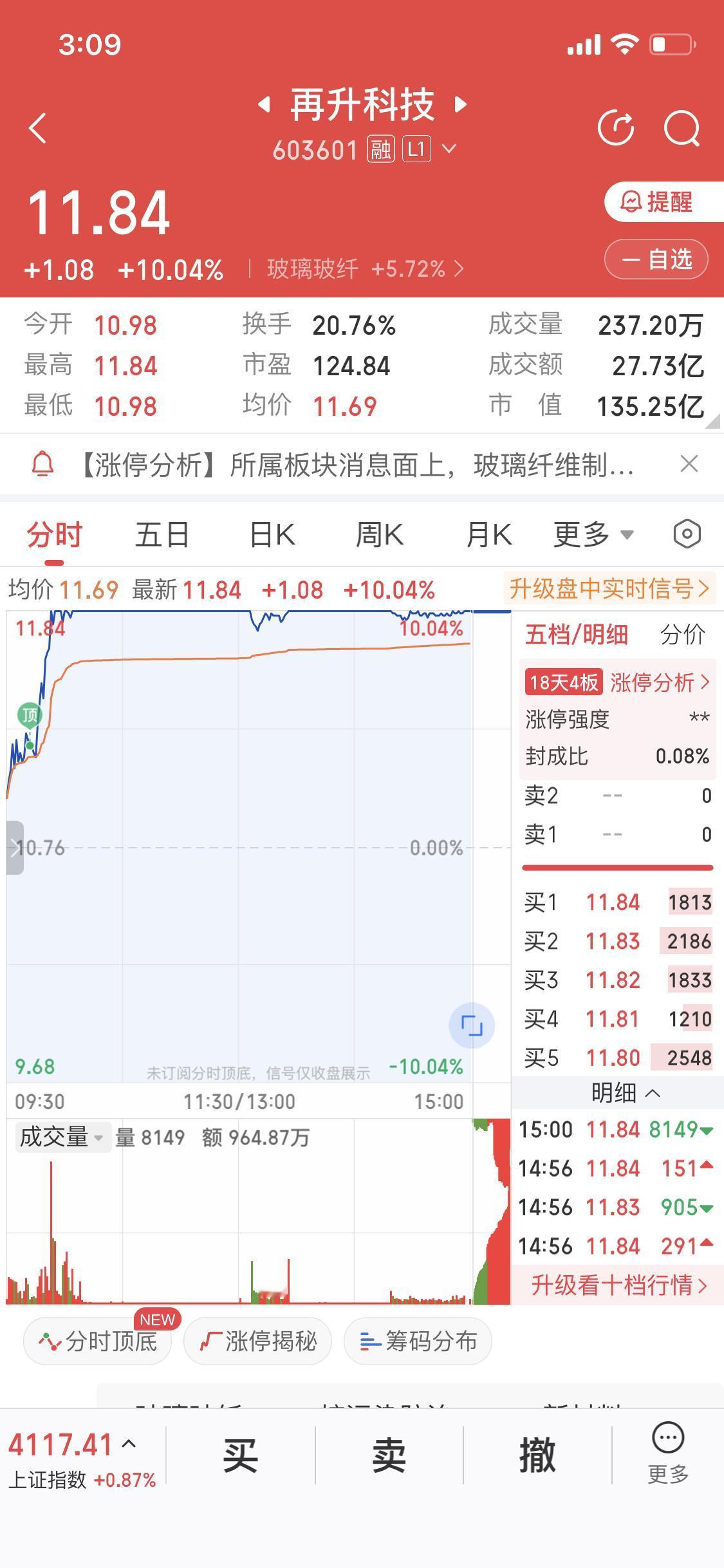 2月24日再升科技那炸板情况,真让人头疼。它多次炸板,我感觉明天大概率得跌,不过这次我没跑。我觉得这不是散户进主力出,而是主力换庄。你看卖一都是几万手,散户哪有这手笔。 当天商业航天概念震荡上涨,再升科技4天2板。消息面上,海南出台方案推动人工智能在航天多环节应用。再升科技之前还连收5个涨停板,当时表现相当亮眼。这次走玻璃纤维逻辑跟涨,或许是商业航天庄把筹码换给了玻璃纤维主力,后续走势值得关注。
