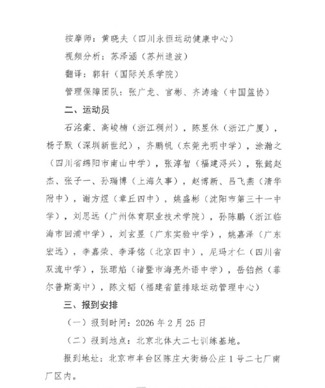 石洺豪、高峻楠(浙江稠州),陈昱休(浙江广厦),杨子默(深圳新世纪),齐鹏帆(东莞光明中学),涂瀚之(四川省绵阳市南山中学),张淳智(福建浔兴),张懿赵杰、张子一、孙瑞博(上海久事),赵博新、吕飞燕(清华附中),谢方煜(章丘四中),姚盛彬(沈阳市第三十一中学),刘思远(广州体育职业技术学院),孙陈鹏(浙江临海市回浦中学),刘玄昱(广东实验中学),姚嘉泽(广东宏远),李嘉荣、李泽铭(北京四中),尼玛才仁(四川省双流中学),张珺焰(诸暨市海亮外语中学),岳铂然(菲尔普斯高中),陈文韬(福建省篮排球运动管理中心)