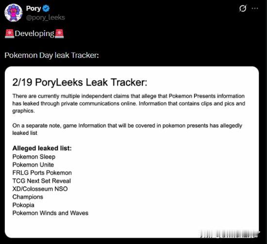 爆料人Pory_Leeks曾准确爆料《宝可梦火红/叶绿》将移植到Switch平
