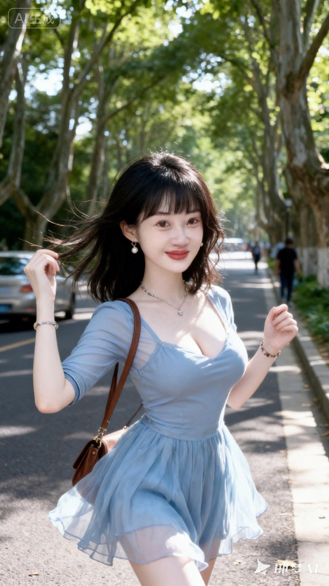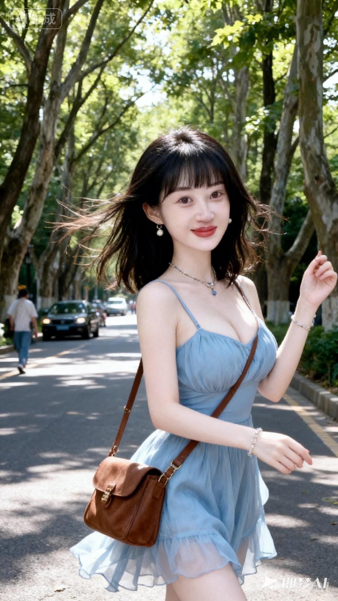 夏日清新穿搭,浅蓝色连衣裙,树荫下的漫步时光🌿👗💃