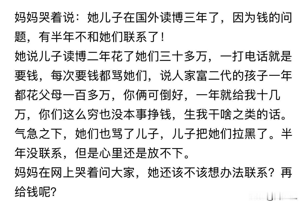 “看哭无数家长!”一位妈妈的求助,引发热议。她的儿子在国外读博,本是全家的骄傲,可这份荣耀,却慢慢变了味。 留学三年,家里已经砸进去三十多万。可儿子非但不感恩,一打电话只会伸手要钱,甚至出言伤人:“别人家富二代一年花一百多万,你们就给我这么点,又穷又没本事,生我干嘛?” 争吵过后,儿子直接把父母拉黑,整整半年杳无音信。妈妈一边心寒,一边又日夜牵挂,纠结着到底要不要主动联系,要不要再给他转钱。 网友们看完纷纷破防。有人说:“读了博士,没把人品读好,最可悲”。 也有人劝:“别再给了,越纵容越觉得理所当然”。 还有人心疼父母:“付出所有,却养出了只懂索取的孩子”。 在周少看来,其实这件事,早已不只是钱的问题。很多家庭都陷入一个误区:觉得把孩子供到高学历,就是最大的成功。可学历再高,不懂感恩、没有担当,也很难真正立得住。 父母的付出,从来都不是无限额的信用卡。一味无底线满足,换来的往往不是珍惜,而是变本加厉的索取。孩子长大成人,尤其是读到博士,理当学会自立,体谅父母的不易。 真正的教育,从来不止分数和文凭,更藏在三观和教养里。懂得体谅父母辛苦,明白赚钱不易,心存感恩与善良,比一张海外文凭重要得多。 这位妈妈的纠结,也在提醒每一个家长:爱要有底线,付出要有边界,别让倾尽所有的爱,养出不懂珍惜的孩子。#寻美三湘# #周少说教育#