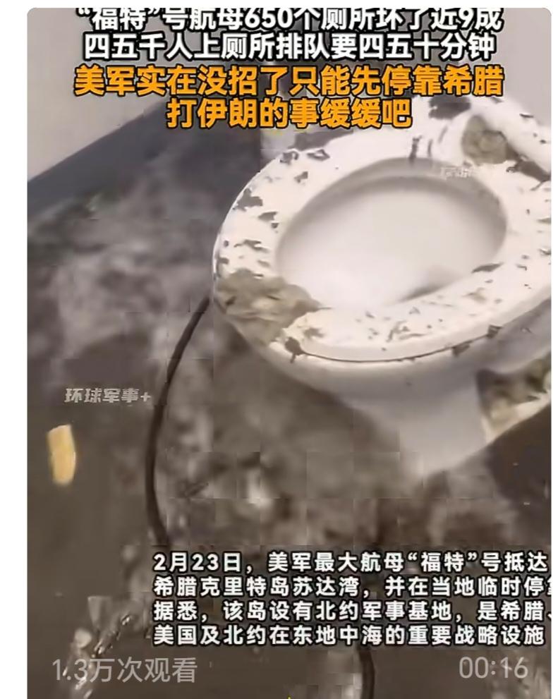 有人说金价下跌是因为美国福特号航母明显消极怠工,船上650个厕所居然坏了500大多。上一趟厕所排队四五十分钟,只能停靠希腊维修。里面乱码七糟什么都有,破衣服、毛巾、拖布等等。 2026年2月23日,福特号确实因真空集便系统大面积故障,紧急停靠在希腊克里特岛苏达湾进行维修。 舰上约650个厕所中,近九成 (约80%-90%)无法使用,仅剩不到70个可用,导致全舰4600多名舰员排队时长长达40-50分钟。 据美军内部邮件披露,除了设计上的技术缺陷外,确实存在舰员滥用系统的情况,调查中发现下水道内有绳索、破布甚至整件军装等异物,人为堵塞是原因之一。 目前没有任何权威信源(如美军方、主流媒体)证实因厕所问题导致“暂时无法打击伊朗”。此次停靠是为了解决生活保獐问题,并未提及取消或暂缓对伊军事行动。 福特号自2025年6月起长期在海上巡航, 此次已是第二次延长部署任务,长时间在海上维持高压状态或许是导致舰上秩序和维护问题频发的重要诱因。