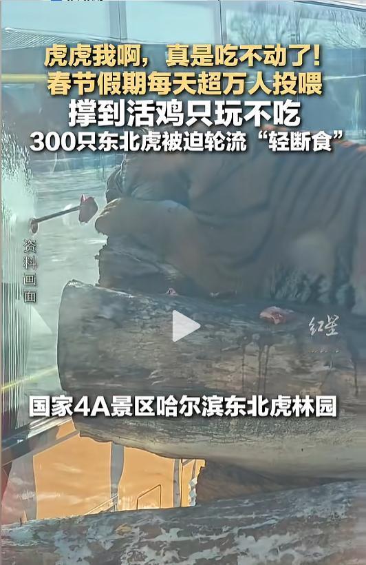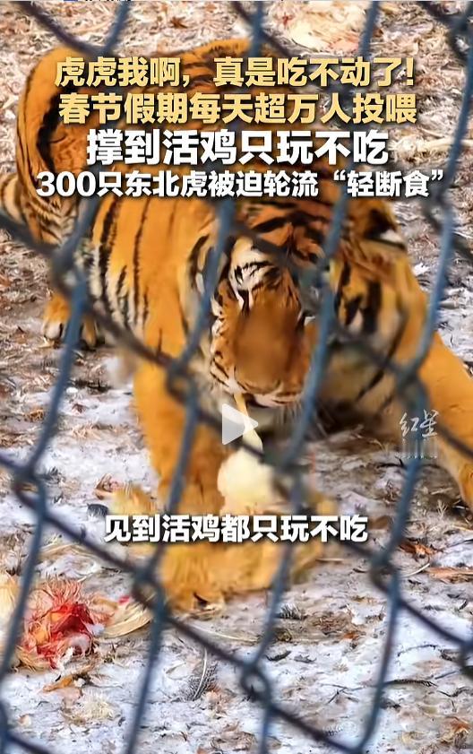 “笑不活了!”近日,黑龙江哈尔滨,国家4A景区哈尔滨东北虎林园的300余只东北虎开始被迫“轻断食”。原来,春节期间,景区被游客挤爆了,每天超万人投喂,这些东北虎们被撑坏了,连活鸡都只玩不吃了。网友:这是吃出工伤了啊! 现在不少动物园都增添了一些投喂业务,游客们除了观赏,还能亲手喂一喂自己喜欢的动物,既增加了游玩乐趣,还帮动物园“省”了饲料。 据媒体2月23日报道,哈尔滨东北虎林园春节期间迎来了游客大爆发,每天有近万人游园投喂,这也给园区带来了不小的困扰——东北虎们被喂得太饱了。 林园内,生活在散放区的东北虎们,有不少都出现了“扶墙”的状态,不少游客拿着拿着鲜肉投喂时,东北虎连头都不带扭的,还有的直接装看不见,更有甚者,活鸡扔他们面前,都只玩不吃了。这让来玩的游客哭笑不得。 为了这些东北虎的健康着想,林园的工作人员启动了“轻断食”的轮休计划。他们将300余只东北虎分成了13组,到轮休日,这一组就不再接受投喂,这样也能更好的让东北虎们恢复往日的精神。 网友看后表示:人逢佳节胖三斤,东北虎们这是胖了“三十斤”啊。一想到过年期间海吃海喝,我的肚子还感觉胀胀的,虎和人,这回有了相同的烦恼! 信息来源:《虎虎我啊,真是吃不动了!春节假期每天超万人投喂 撑到活鸡只玩不吃 300只东北虎被迫轮流“轻断食”》红星新闻