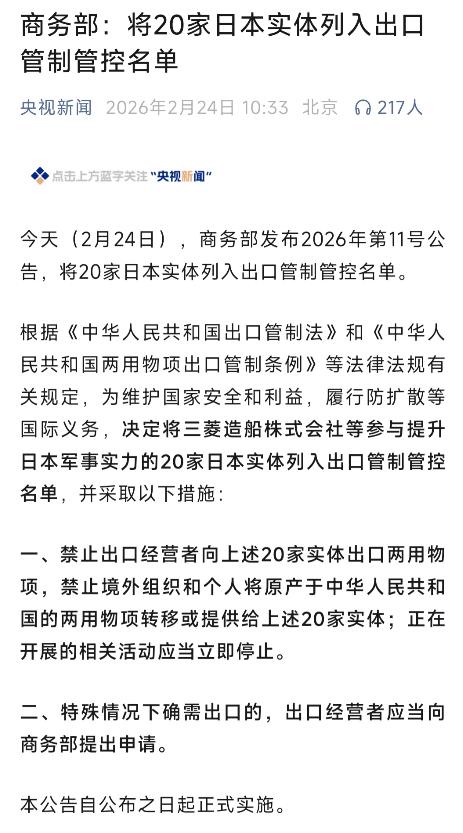 高市早苗天天叫嚣“台海有事”,原来三菱造船、川崎重工等20家日本军工企业,就是她叫嚣的底气与后盾,现在被中国直接列入出口管制清单,这下舒服了没有,日本?   你们总怕美国制裁,却忘了中国不是不会反制,只是一直顾全大局、不愿轻易出手,我们已经给足了几个月的耐心与机会,如今仁至义尽,后续再吃亏、再受疼,千万不要出来叫苦叫屈!   这几家被点名的企业,根本不是什么无辜的“白莲花”,它们实打实地参与了日本军事力量的扩张与更新。三菱重工造什么?它造苍龙级潜艇,还研发制造日本最先进的F-35战机生产线;川崎重工也不遑多让,P-1反潜巡逻机、C-2运输机都是它的手笔。   这些装备哪一个不是针对台海局势量身定做的“利齿”?高市早苗那些激进言论,背后就是这些钢铁巨兽在撑腰,它们妄图把台海变成火海,中国这招出口管制,恰恰是打蛇打七寸,精准掐断了这些军工巨头的关键供应链。   很多人总觉得只有西方国家搞制裁,发展中国家只能被动挨打,这种旧观念早就该扔进垃圾堆了。中国这次出手,依据的是《中华人民共和国出口管制法》以及相关行政法规,完全合理合法。我们并非要针对谁,而是这些实体危害了中国的国家安全利益。   商务部这一动作,清晰地向世界划出了一条红线:任何试图损害中国核心利益的企业,不管你总部在东京还是在华盛顿,都必须付出实实在在的代价。这不是情绪化的报复,而是维护国家主权的必要法律程序。   大家看看这时间点,也挺有意思,绝非偶然。此前日本不仅紧跟美国步伐对半导体设备出口设限,还在各种场合煽风点火,渲染“中国威胁论”。我们给了几个月的观察期,这期间日本政府不但没有收敛,反而变本加厉。   忍耐是有限度的,善意不是无原则的退让。如今将这20家实体列入清单,就是明确告知日方:听懂中方的警告不需要翻译,如果非要装听不懂,那就用实际行动来“帮助”你们理解。后续若日方继续装傻充愣,这份管制名单恐怕还会加长,涉及的领域也可能会更广。   这就引出了一个关键问题,这一招到底疼不疼?疼,而且很疼。现代军工制造极其依赖稀土、钨、钼等关键战略资源以及精密的零部件加工能力。   中国掌握着全球绝大部分稀土加工链条,光伏级多晶硅、钨制品的出口控制,能直接让这些军工企业的生产线面临断供风险。三菱重工也好,川崎重工也罢,它们的高端制造离不开从中国进口的原材料。   一旦供应链被切断,它们那些雄心勃勃的造舰计划、战机研发进度,立马就会面临“卡脖子”的窘境,这叫什么?这就叫“以其人之道,还治其人之身”。   日本国内某些人总有一种错觉,认为抱着美国的大腿就能高枕无忧,甚至幻想干涉中国内政不需要成本。这次出口管制就是一堂生动的“成本核算课”。   高市早苗之流政客叫唤得欢,是因为她们不需要为企业的利润负责,不需要为工人的饭碗负责。   现在中国政府把账单寄到了企业门口,日本财经界和制造业巨头们自然会去掂量掂量,到底值不值得为了几个政客的政治私利,搭上企业的未来。这种内部利益的撕裂,才是对日本右翼势力最有力的回击。   未来中日之间的博弈肯定还会持续,但这回中国算是把规矩立下了。我们不再是那个只会口头抗议的国家,手里握着供应链的王牌,我们完全有能力让对手感到痛感。   那些被列入清单的企业,以后再想从中国获取关键物资,必须经过严格审查,这直接削弱了它们制造武器威胁中国的能力。   日本若真想解决问题,唯一的出路就是端正态度,停止在台湾问题上玩火。毕竟,中国的大门是敞开的,但门禁卡只发给朋友,不给吃着中国饭、砸着中国锅的人。