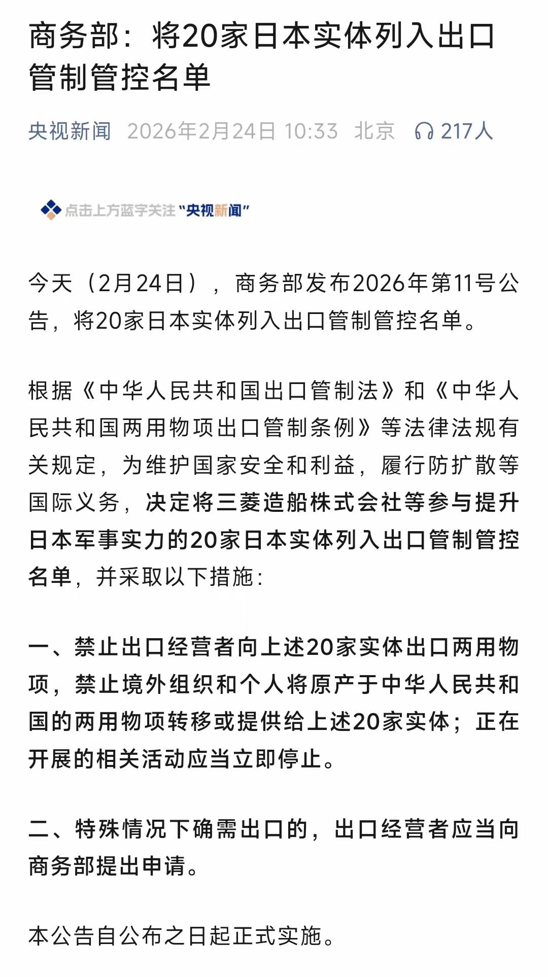 高市早苗天天叫嚣“台海有事”,原来三菱造船、川崎重工等20家日本军工企业,就是她叫嚣的底气与后盾,现在被中国直接列入出口管制清单,这下舒服了没有,日本? 这回可不是嘴上说说。2月24号,商务部直接把那20家日本实体钉在了管控名单上。三菱重工旗下那几家公司,造船的、造航空发动机的,一个没落下。还有那个听起来挺唬人的“防卫大学”,也进去了。 日本那边估计都懵了。特别是那个富士通防卫,专门搞军事安全的,这下从中国进口零部件?门儿都没有。更绝的是旁边还挂着个“关注名单”,斯巴鲁这种看着人畜无害的车企也在上头。意思很明白,老实配合核查,不然随时转正。 高市早苗前脚刚在国会喊完话,说什么要和中国搞战略互惠关系。这话听着怎么这么耳熟?去年她喊“台湾有事就是日本有事”的时候,也是这副嘴脸。外交部林剑把话说得透透的:真想发展关系,先把那套涉台言论收回去。 可人家偏不,觉得背后站着这些军工大佬,腰杆子硬。现在好了,这20家“底气”全被掐了脖子。商务部说得明白,这招就是为了制止日本“再军事化”。你要造武器?可以。但别想一边从中国进口两用物项,一边拿这些东西对付中国。 这事最妙的地方在这儿。那些日本企业手里拿着中国的订单,生产线上的稀土、精密零件,哪样离得开中国?现在全断了。股市那边反应最诚实,相关军工股应声往下掉。这叫啥?这叫用真金白银替政客的愚蠢买单。 日本海洋联合株式会社那几家造军舰的,这会儿估计肠子都悔青了。平时闷声发财不好吗?非得跟着政客瞎折腾。现在好了,生产线上的活儿全停,等着喝西北风吧。 这一巴掌扇得响。你不是要“再军事化”吗?你不是要拥核吗?那我就让你连造武器的材料都凑不齐。这哪是什么出口管制,这就是给日本右翼上了一课:别拿台海局势当儿戏。 各位读者你们怎么看?欢迎在评论区讨论。