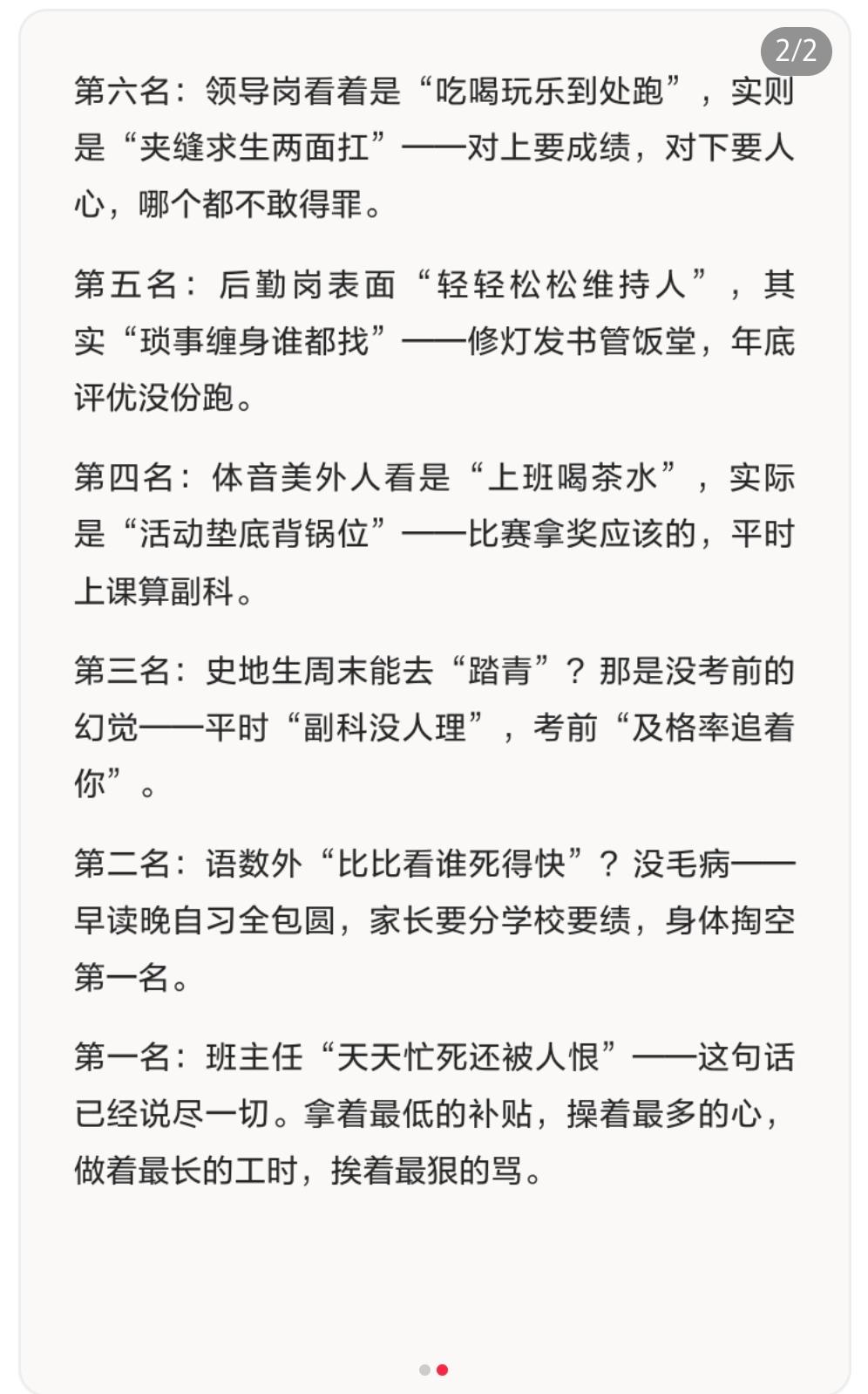 既真实又让人笑不出来的“2026教师最累排行榜”👇 第六名:领导岗看着是“吃喝玩乐到处跑”,实则是“夹缝求生两面扛”——对上要成绩,对下要人心,哪个都不敢得罪。 第五名:后勤岗表面“轻轻松松维持人”,其实“琐事缠身谁都找”——修灯发书管饭堂,年底评优没份跑。 第四名:体音美外人看是“上班喝茶水”,实际是“活动垫底背锅位”——比赛拿奖应该的,平时上课算副科。 第三名:史地生周末能去“踏青”?那是没考前的幻觉——平时“副科没人理”,考前“及格率追着你”。 第二名:语数外“比比看谁死得快”?没毛病——早读晚自习全包圆,家长要分学校要绩,身体掏空第一名。 第一名:班主任“天天忙死还被人恨”——这句话已经说尽一切。拿着最低的补贴,操着最多的心,做着最长的工时,挨着最狠的骂。老师心累瞬间 教师真实困境 教师心理现状