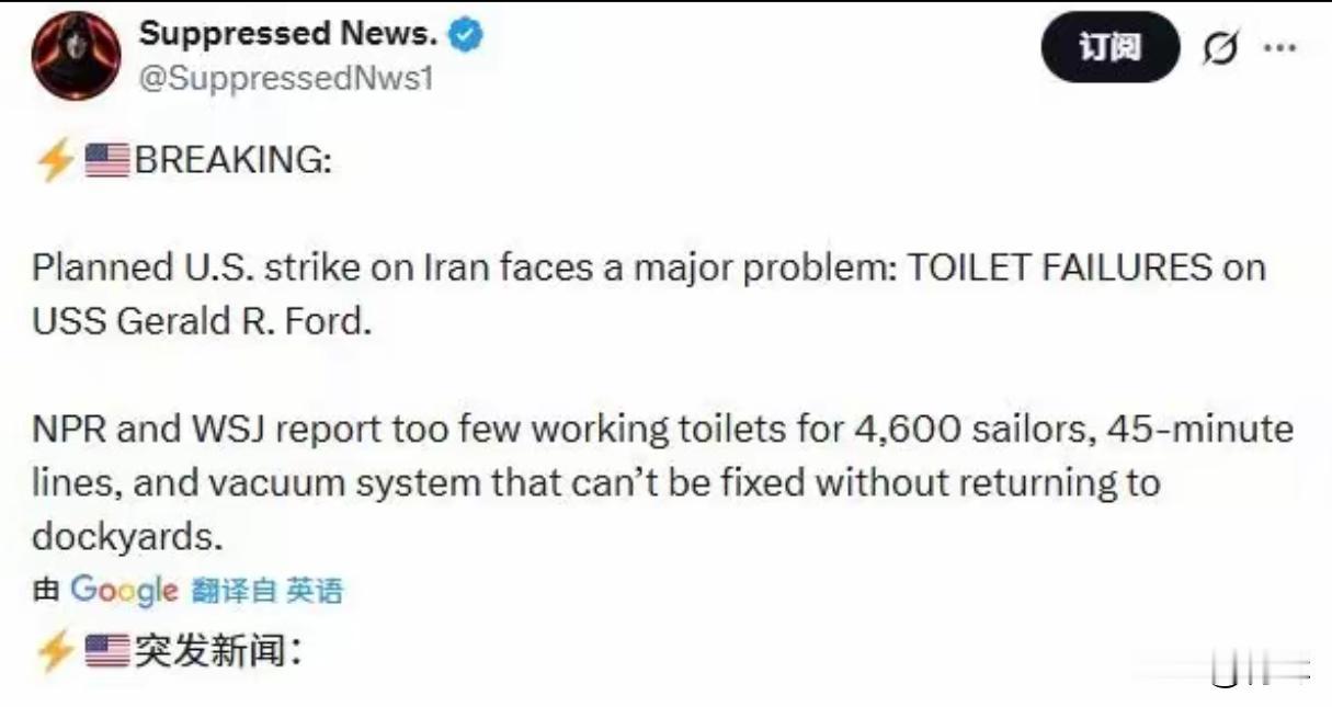 打伊朗先缓缓,福特号航空母舰上的厕所坏了 福特号航空母舰按照原计划应该部署到中东对伊朗进行军事威慑。然而现在,这艘航空母舰正在希腊的克里特岛苏达湾停靠。除了进行正常的补给之外,还有一个原因——厕所坏了,坏的很离谱。 目前福特号航空母舰上的四五千人,如果想要上厕所的话需要排队,有人甚至要等四五十分钟才可以上厕所。航母上原有的650个厕所已经坏了90%。原因是有人刻意的往其中一个厕所里扔东西。由于航母的厕所粪便收集系统使用的是真空设备,所以直接导致了设备故障和一定的堵塞。 可能看到这里有的朋友会比较奇怪,按说厕所故障并不是什么核心故障。航母完全可以一边走一边修。但问题是,航空母舰必须在停靠状态下才能够对厕所系统进行维修。除此之外,还要考虑到这四五千人的如厕问题。所以这已经实质意义上影响了这艘美国最先进航空母舰的作战能力了。 而按照这种情况发展下去,如果厕所故障一时半会修不好的话,那么美国要打伊朗这件事情可能还真的要缓缓。[看]