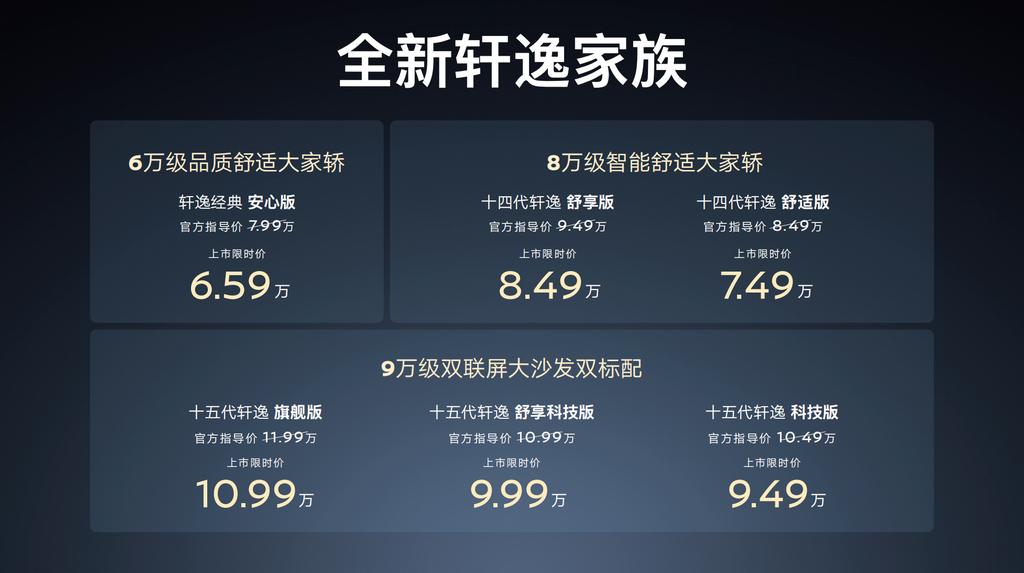【限时9.49万起,全新一代日产轩逸上市】日前,全新一代日产轩逸上市,推出3个配置车型,限时价9.49-10.99万元;同步上市的还有新款经典轩逸、十四代轩逸,分别售6.59万元、7.49-8.49万元。新车长4656mm、宽1825mm、高1448mm,轴距2712mm,较现款车长+4mm、宽+10mm、高-2mm。外观采用V字密幅镀铬格栅、T字形贯穿灯带、矩阵式LED大灯及熏黑贯穿尾灯,内饰配双联屏与高通骁龙8155芯片,支持CarPlay、Type-C、无线充电,保留双温区空调物理键。动力沿用1.6L自吸发动机,最大功率99kW,匹配CVT变速箱。【来自懂车帝车友圈】