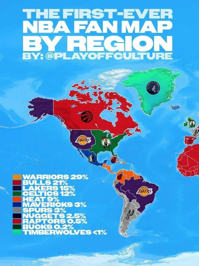 在全世界各个国家地区,人气最高的NBA球队是哪个?有媒体发布了这张“粉籍地图”,勇士队是东亚、南亚、东南亚、澳洲的人气王,凯尔特人在美国东部及英国这样的传统白人占据主导的地区是最受欢迎的球队,热火则在拉美、中东拥有超高人气!这份地图大体上体现了真实情况吗?NBA