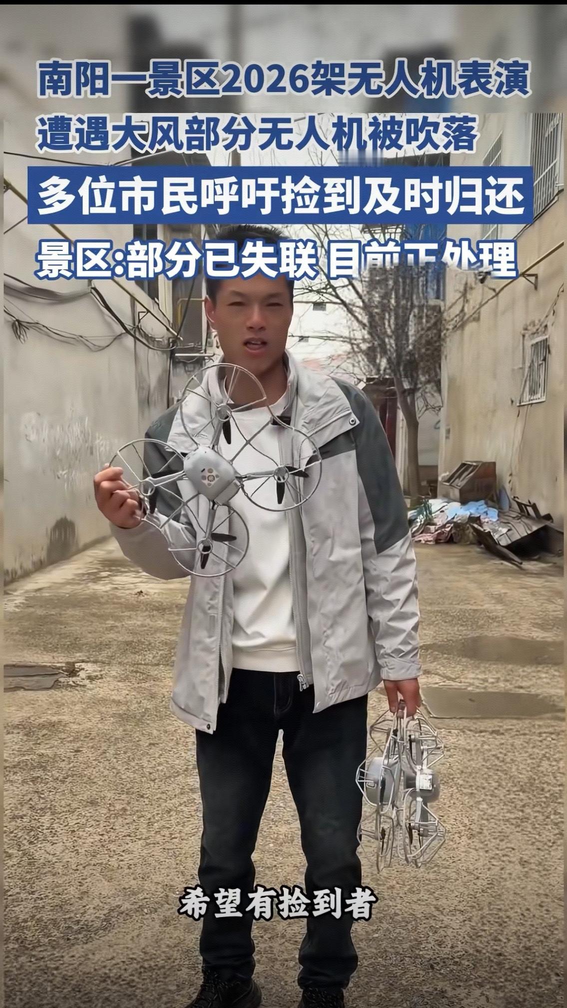 南阳2026架无人机被大风刮落:有人捡走不还,有人连夜送回,人性在这一刻藏不住了 南阳一景区2026架无人机表演遭遇大风部分无人机被吹落多位市民呼吁捡到及时归还景区:部分已失联目前正处理。 正月初六的夜晚,卧龙岗本该上演一场震撼全城的光影盛宴,2026架无人机承载着新春祝福腾空而起,却被突如其来的7级大风打乱阵脚。无人机如同繁星坠落,有的挂在树梢,有的落在路边,还有的消失在居民区,一场精心筹备的表演,意外变成了对人心的考验。 现场游客拍下视频,漫天无人机散落的画面令人心疼。景区工作人员彻夜寻找,技术团队心急如焚,这些无人机不仅是设备,更是景区为春节筹备的心意,是无数人加班加点的成果。消息传开后,南阳市民自发行动起来,有人在朋友圈刷屏呼吁归还,有人出门四处寻找,还有人捡到后第一时间送到景区,连联系方式都不肯留。 但暖心之外,也有让人无奈的现实:部分无人机至今失联,有人捡到后悄悄带走,甚至有人想着占为己有。景区无奈发声,同时给出暖心回馈,主动归还者可获旅游年卡与门票,用善意回应善意,也盼着走失的“伙伴”能早日回家。 一场意外,照见了最真实的人性。有人拾金不昧,用行动守护城市温度;有人私心作祟,让小事蒙上阴影。2026架无人机,飞的是科技,落的是人心。南阳这座城市的温暖,从来不在光鲜的表演里,而在市民主动归还的举手之劳中。 目前景区仍在全力寻找失联无人机,我们也呼吁,捡到的朋友请及时归还。留住一份善意,守护一座城的体面,这才是春节最珍贵的礼物。你身边遇到过这样的暖心事吗?评论区说说你的看法!南阳无人机系统