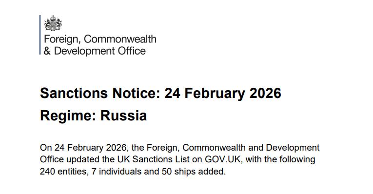 新闻快讯——2026年2月24日,英国外交、联邦及发展事务部(FCDO)更新了GOV.UK网站上的英国制裁名单,新增了240个实体、7名个人和50艘船舶。 消息来源RT
