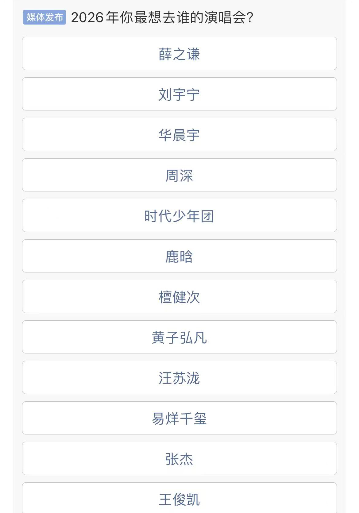 媒体发布票选2026最想去的演唱会:一:薛之谦二:刘宇宁三:华晨宇四:周深五:时代少年团六:鹿晗七:檀健次八:黄子弘凡九:汪苏泷十:易烊千玺十一:张杰十二:王俊凯网友目前投票最多的是华晨宇演唱会,今年你最想去谁的演唱会?