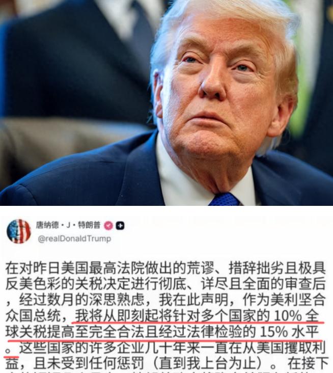 大家发现没有,从10%再到15%,全世界都不搭理了,不仅我们一句话不说,欧盟日韩也都只是象征性的发个声明。这意味着什么? 特朗普在白宫椭圆形办公室签了一份行政令,直接宣布要对所有运到美国的进口商品,统一征收10%的临时关税,这个政策先定了150天的期限,后续还能往上调整,最高能加到15%。 更关键的是,这个命令签完三天就要正式生效,一点缓冲和商量的余地都没给各国留。 按咱们往常的印象,美国作为全球顶尖的经济体,突然搞出这么个全面加征关税的大动作,放在以前绝对是全球贸易圈的大地震。 各国肯定得第一时间扎堆站出来,要么强烈抗议发声,要么赶紧出台反制措施,要么急着拉着美国坐下来谈判,就连全球股市都得跟着晃悠几下。 可这次的情况,完全跟大家想的不一样。 别说咱们这边没大张旗鼓地跟着回应,就连平时跟美国穿一条裤子的欧盟、日本、韩国这些盟友,也都只是不痛不痒地发了个声明,说了几句场面话,连点实打实的反制动作都没有。 全世界跟提前约好了一样,集体装没看见,压根不搭理特朗普这波操作。 以前一拿关税说事就闹得沸沸扬扬,这次怎么全世界都集体沉默了?其实说白了,不是大家怕了,而是这招特朗普用得太烂了,各国早就看腻了,也早就有了应对的底气。 首先就是狼来了的故事喊多了,谁也不会再当真了。 从特朗普第一任期开始,他就天天拿着关税大棒到处挥,今天给这个国家的商品加税,明天给那个地区的产品设限,这几年下来,关税政策变来变去,光2025年一年,美国的实际关税税率就改了六十多次。 一开始各国还会紧张,赶紧想办法应对,可次数多了,大家早就麻了,有了十足的免疫力。 就像一个人天天在你旁边喊要打雷下雨,结果每次都是干打雷不下雨,时间长了,谁还会特意为他这句话做准备呢? 再者说,这次的关税政策,看着声势浩大,其实本身就站不住脚,就是个临时的“救火”政策,根本长不了。 这次特朗普急着签这个行政令,核心原因是之前他绕开国会搞的那些紧急关税,直接被美国最高法院裁定违法了。 他急急忙忙搞出这个10%的关税,就是为了顶替之前被废掉的政策,找补点面子。 而且这个政策是靠着1974年《贸易法》第122条签的,白纸黑字写得很清楚,最多只能执行150天,除非美国国会批准延期,不然到点就得自动作废。 各国心里都门儿清,这就是个短命的政策,犯不上为了这个临时政策大动干戈。 你这边辛辛苦苦出台一堆反制措施,结果没俩月,美国那边政策又变了,甚至直接作废了,纯属白费功夫。 更何况现在美国自己家里都吵翻了天,已经有超过一千家企业,还有十二个州,都联合起来起诉特朗普的关税政策,说他乱加税的行为违背了美国宪法。 美国自己内部都乱成一锅粥,各国就更没必要凑这个热闹,安安静静看着就够了。 还有最关键的一点,这个关税大棒看着吓人,其实打出去没多少力道,反倒先伤到了美国自己。 这次的关税看着是对全球所有商品征收,可实际上豁免了一大堆东西。 像能源产品、关键矿产、金银、化肥这些美国自己生产不了,或者产量根本不够用的商品,全都不在征税范围里;就连加拿大和墨西哥这两个邻居,符合美墨加协定的商品也都免了税。 真正需要交税的商品,其实没多少,对各国出口的实际影响,远没有特朗普喊得那么夸张。 反倒是美国自己的老百姓和企业,先得为这个关税买单。 进口商品加了税,最后增加的成本肯定会转嫁到美国消费者身上,超市里的东西更贵了,生活成本更高了,国内的通胀又得跟着往上走。 就连美国自己的经济学家都算过账,之前特朗普加征的钢铝关税,每保住一个钢铁行业的就业岗位,下游行业就要多付出65万美元的成本,完全是赔本赚吆喝的买卖。 各国都看明白了,这招就是特朗普自己玩的内耗游戏,犯不上跟着他一起瞎折腾。 最后就是,各国早就给自己找好后路了,早就不指着美国这一个市场吃饭了。 这几年特朗普天天拿关税说事,动不动就用贸易制裁威胁人,各国早就看明白了,不能把鸡蛋都放在美国这一个篮子里。 这些年,大家都在忙着搞贸易多元化,跟更多国家签自贸协定,开拓新的市场,一点点降低对美国市场的依赖。 欧盟一边跟东南亚、拉美国家谈新的贸易合作,一边自己内部搞产业调整;日韩也没闲着,这些年一直在拓展东南亚、中东的市场,对美国的出口依赖度早就降下来了。 既然美国市场没那么重要了,那你加不加关税,自然也就掀不起多大的波澜。 所以你看,这次特朗普又把关税大棒高高挥起来了,结果全世界都懒得搭理。 一个自己内部都站不住脚的临时政策,一个用了无数次的老套路,一个伤敌八百自损一千的昏招,谁还会当回事呢?与其跟着他的节奏乱了自己的步子,不如安安静静看着,等他自己把这出戏唱完就完事了。
