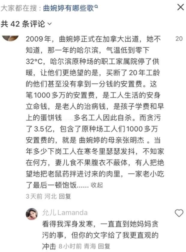 曲婉婷新账号开通不足24小时,便被清空封.禁。 2月21日,一个认证为“原创音乐人”的曲婉婷新账号发布弹唱视频,试图在国内社交平台复出,并开通了商品橱.窗。账号很快就涨粉过万,但关闭了评论功能。在网友的强烈反对声中,平台于次日清空了该账号的所有信息。 曲婉婷的母亲张明杰,系哈尔滨市原道里区副区长,因贪污受贿、滥用职权,造成2.3亿元公共财产损失,并直接导致下岗职工陷入困境,于2021年被判处无期徒刑,剥夺政治权利终身,并处没收个人全部财产。 她们是喝下岗职工的血过上了奢侈的生活!谁给她的胆量企图在国内复出的! 张明杰如今已入狱12年。多年来,作为案件直接受益人,曲婉婷长期在海外生活。网友指控曲婉婷留学及音乐事业依赖赃.款支撑,却在母亲被捕后滞留加拿大,以“云尽孝”名义发歌《最好的安排》称母亲为“英雄”,但从未就母亲的罪行公开道歉,也未退还赃款。 这件事不仅涉及巨额国.资损失,也牵连众多职工安置权益,因此社会记忆格外深刻。虽然曲婉婷现在落魄了,但是556个家庭的钱还是回不来,走的人也回不来。那年的东北那么冷,无法忘记她母亲犯下的罪,对这样的人坚决抵制!