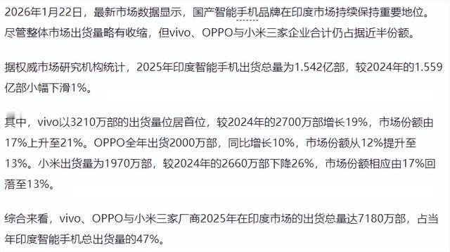 印度手机市场大洗牌!这品牌闷声发大财 刷ZOL科技板块,印度手机市场数据简直笑麻了! vivo一年猛增19%,直接冲上第一;小米差点跌出前三,看得人直呼刺激。 而OPPO看似不显山露水,仅10%的增幅,却稳得一批,份额还悄悄涨了! 在印度这片出海热土,vivo砸钱抢地盘,小米步子迈太大,OPPO却另辟蹊径,玩起“机海战术+渠道深耕”。Reno、A、K系列组合拳,全面撒网,精准拿捏消费者。 别以为印度只有贫民窟,孟买、德里等地的中产阶级,购买力强到能吊打国内二线!而且印度线下交易才是王道,OPPO深耕线下,闷声把钱赚。 这年头,不少品牌追求一夜爆单,OPPO却坚持每款都盈利、每季稳增长。看似低调,实则闷声发大财,财务报表直接笑到最后!这波操作,你怎么看?