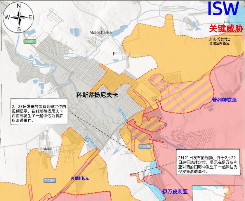 决战双子城之外围争夺:俄源信息称俄军已经攻入利曼 2月23日,俄军事博主发布未经证实的消息,俄军在利曼战场实现多点突破,具体推进方向包括利曼城区内部、利曼以南的斯塔伊卡拉万、利曼以东的马斯利亚基夫卡等地。此外,该区域的战斗已延伸至斯拉维扬斯克东部外围,俄博主还声称,俄军在斯拉维扬斯克以东的卡列尼基、里兹尼科夫卡、克里瓦卢卡以及斯拉维扬斯克东南的尼基福里夫卡均实现推进。 2月22日至23日发布的地理定位视频显示,俄军在利普伊夫卡实施了渗透行动,但并未改变当前的地形控制权或战场前沿态势。 俄军事博主声称,乌军在尼基福里夫卡和斯塔伊卡拉万附近组织了反击,试图遏制俄军的推进势头。 另一条未经证实的消息称,俄军沿斯拉维扬斯克以东的克里瓦卢卡-里兹尼科夫卡一线推进,扩大了里兹尼科夫卡地区存在争议的“灰色地带”,并将乌军从里兹尼科夫卡以北的高地驱逐。 为切断斯拉维扬斯克的外围补给线,俄军动用精确制导武器对关键基础设施实施打击。2月23日发布的地理定位影像资料显示,俄军使用FAB-500制导滑翔炸弹袭击了斯拉维扬斯克以北的博霍罗迪奇内地区的一座桥梁。 在康斯坦丁诺夫卡方向,2月20日发布的视频显示,俄军近期在康斯坦丁诺夫卡以北的维罗柳比夫卡南部实现推进,这是ISW明确证实的俄军在双子城外围南部的有效进展。 与此同时,俄军在康斯坦丁诺夫卡外围实施了渗透行动。2月23日的地理定位影像资料显示,俄军在康斯坦丁诺夫卡西南郊区以及康斯坦丁诺夫卡东南的伊万诺皮利亚以西区域活动,此次行动属于俄军的渗透任务,并未改变该区域的地形控制权或战场前沿态势,但这一渗透行动无疑加剧了康斯坦丁诺夫卡乌军的防御压力,形成“正面猛攻+侧翼渗透”的战术态势。 有未经证实的俄源信息称,俄军在康斯坦丁诺夫卡以南的别列斯托克东北部实现推进。 据悉,俄军在康斯坦丁诺夫卡附近动用了FAB-500制导滑翔炸弹和Kh-38ML空对地导弹打击桥梁等关键目标。其中,Kh-38ML空对地导弹是俄军一款模块化精确制导武器,射程可达3至40公里,最大飞行速度2.2马赫,可搭载多种战斗部,主要用于打击装甲目标、桥梁等硬目标,与FAB-500滑翔炸弹协同使用,进一步强化了俄军对康斯坦丁诺夫卡外围补给线的封锁能力。 (本文部分参考战争研究所报告)
