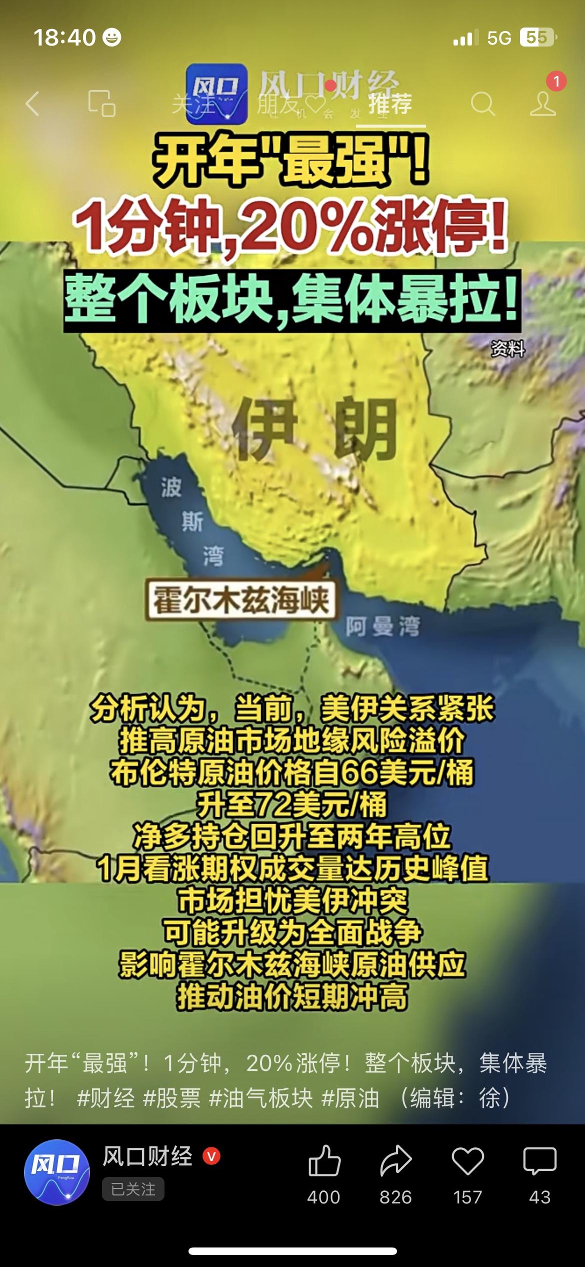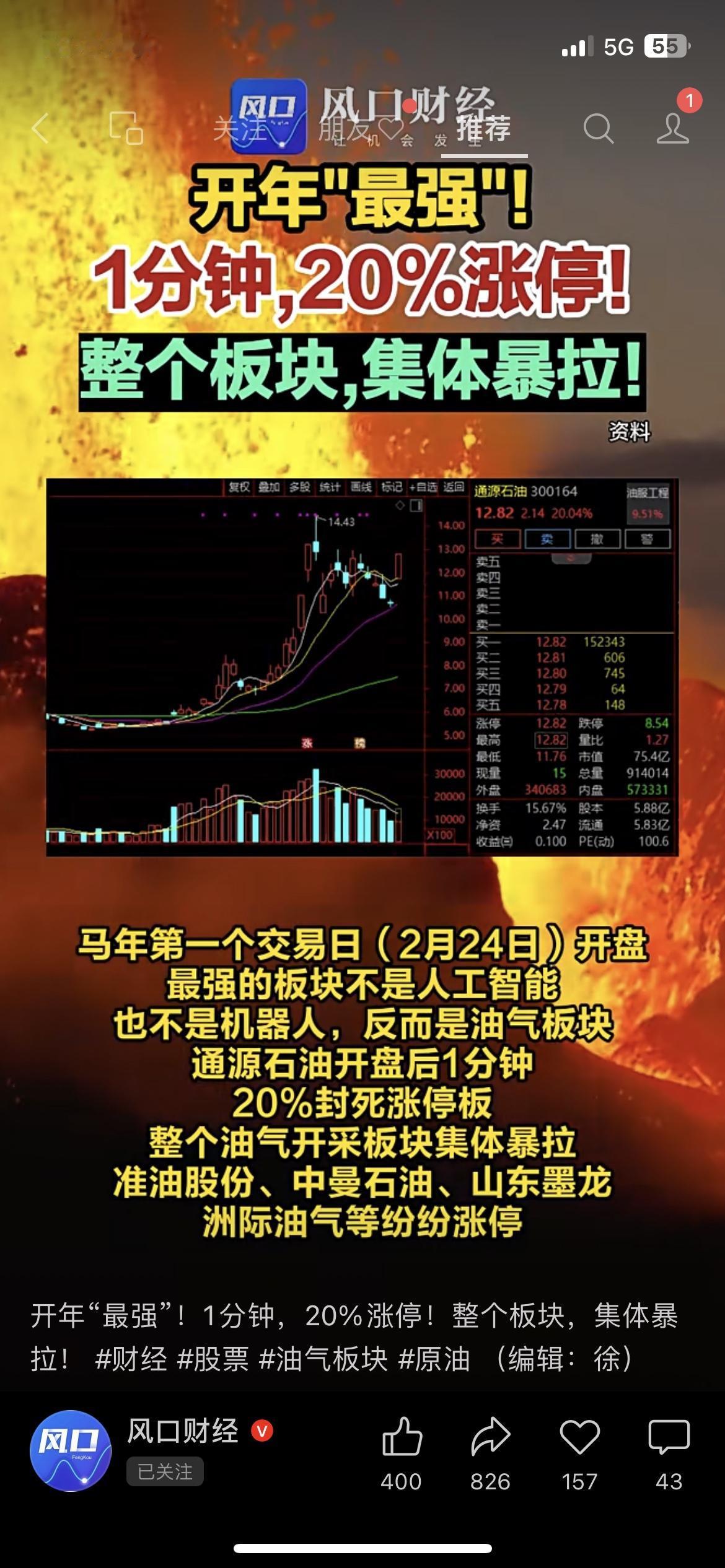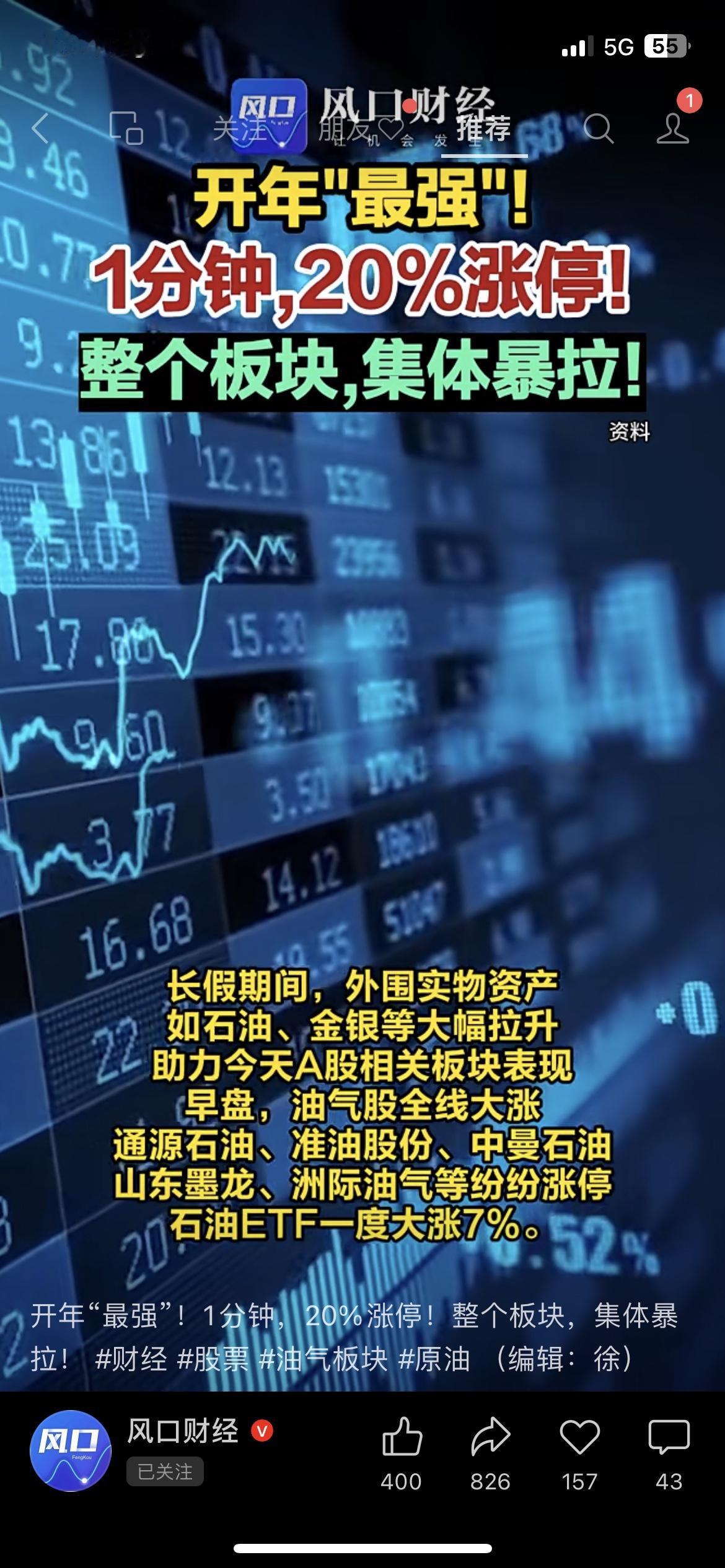 马年开盘,油气板块炸了! 通源石油开盘1分钟,直接20%涨停。 整个油气开采板块集体暴拉,准油股份、中曼石油等纷纷涨停。 石油ETF一度大涨7%。 原因很简单:美伊关系紧张,推高原油价格。 但我要提醒一句: 周期股波动大,别盲目追高。 油气板块 原油 A股开盘 市场有风险,投资需谨慎,本文不构成任何投资建议。