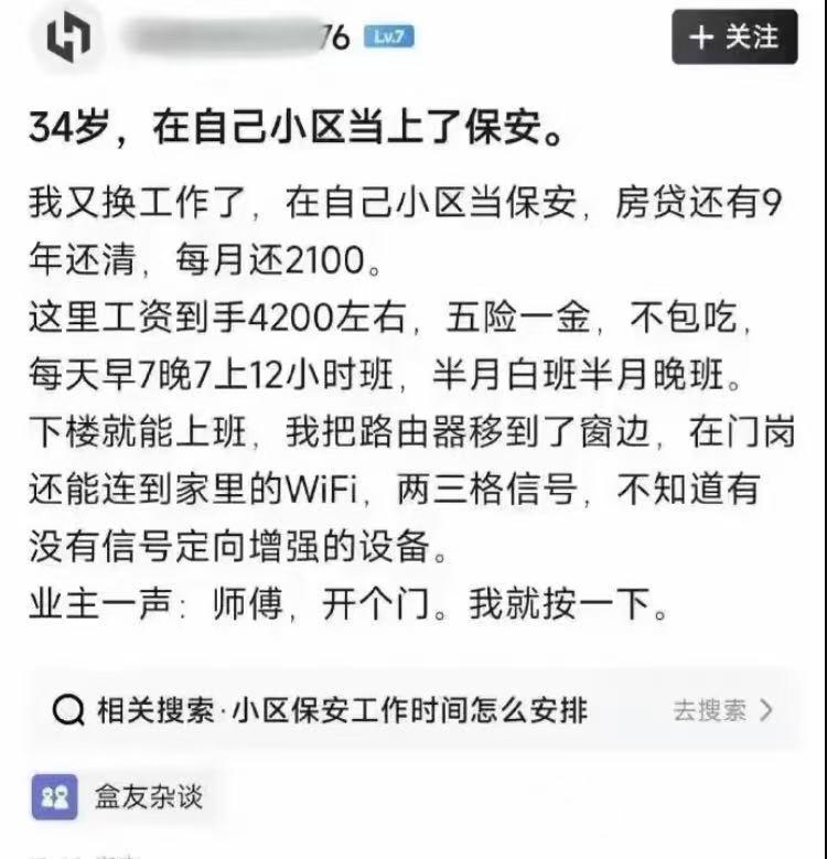 帖子里说的这份工,你可千万别以为他在说梦话!还真有“身兼两职”,他这份工作你可以这样理解:白天当保安“骂业主”晚上当业主“骂保安”,角色对换而已。 说说我见到的真事,我隔壁一个去年新竣工的小区招了一名河南小伙,他20w供了一套房就在小区里面,月供1900!他在自己小区做物业安保,亭子有空调,就坐里面或者附近溜达,负责开门就行。工资扣完五险一金还有4800,他不抽烟,减去房贷还剩2900。 关键是到时候他还完房贷,自己的社保也交够15年以上了,直接退休又可以每个月领退休金。房贷与养老社保直接解决,工作还轻松。他天天在保安亭看小说,玩游戏,相对于这种人,他还能有什么不知足的呢。