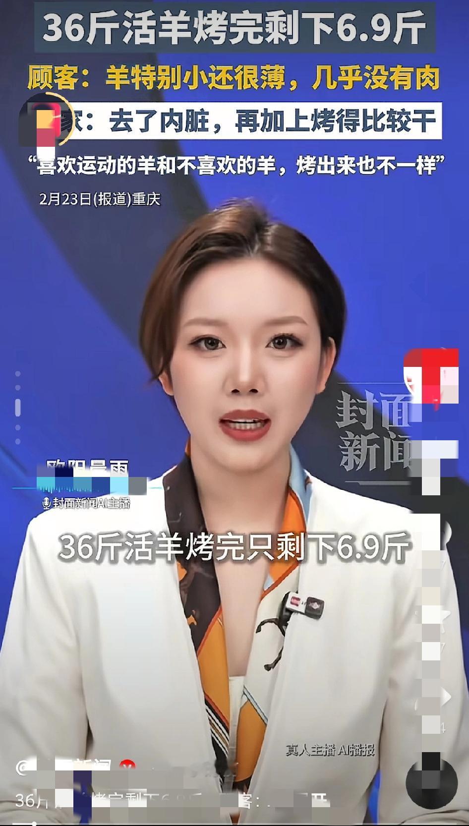 重庆女子除夕夜带全家吃烤全羊,现场称重36斤, 还做了标记防掉包。 结果端上桌又干又小, 几乎没肉,复称只有6.9斤, 商家还嘴硬说正常。 正常损耗根本不会这么夸张, 36斤活羊烤熟至少该有10斤以上,明眼人都知道有问题。 官方已查实, 商家提前给羊猛灌水喂饲料, 故意虚增重,纯属消费欺诈。 花1188元买的不是羊肉, 是一肚子气。 团圆饭图的是开心, 不是被人当冤大头。 做生意靠的是诚信, 不是耍小聪明坑顾客。 你外出吃饭遇到过这种缺斤短两的事吗?烤全羊 全羊烤全羊