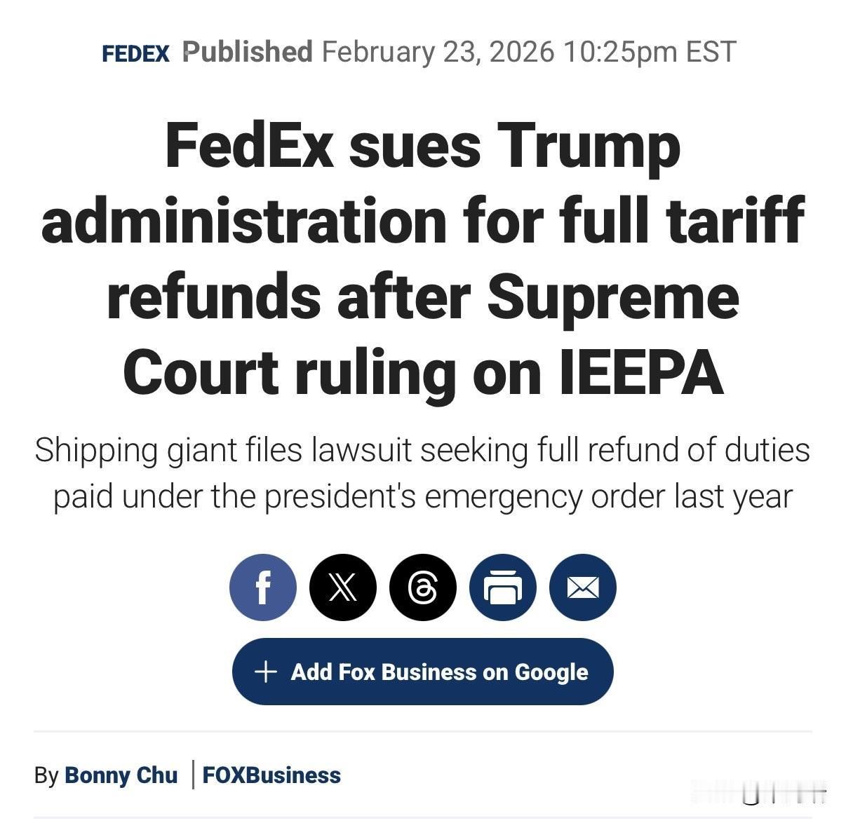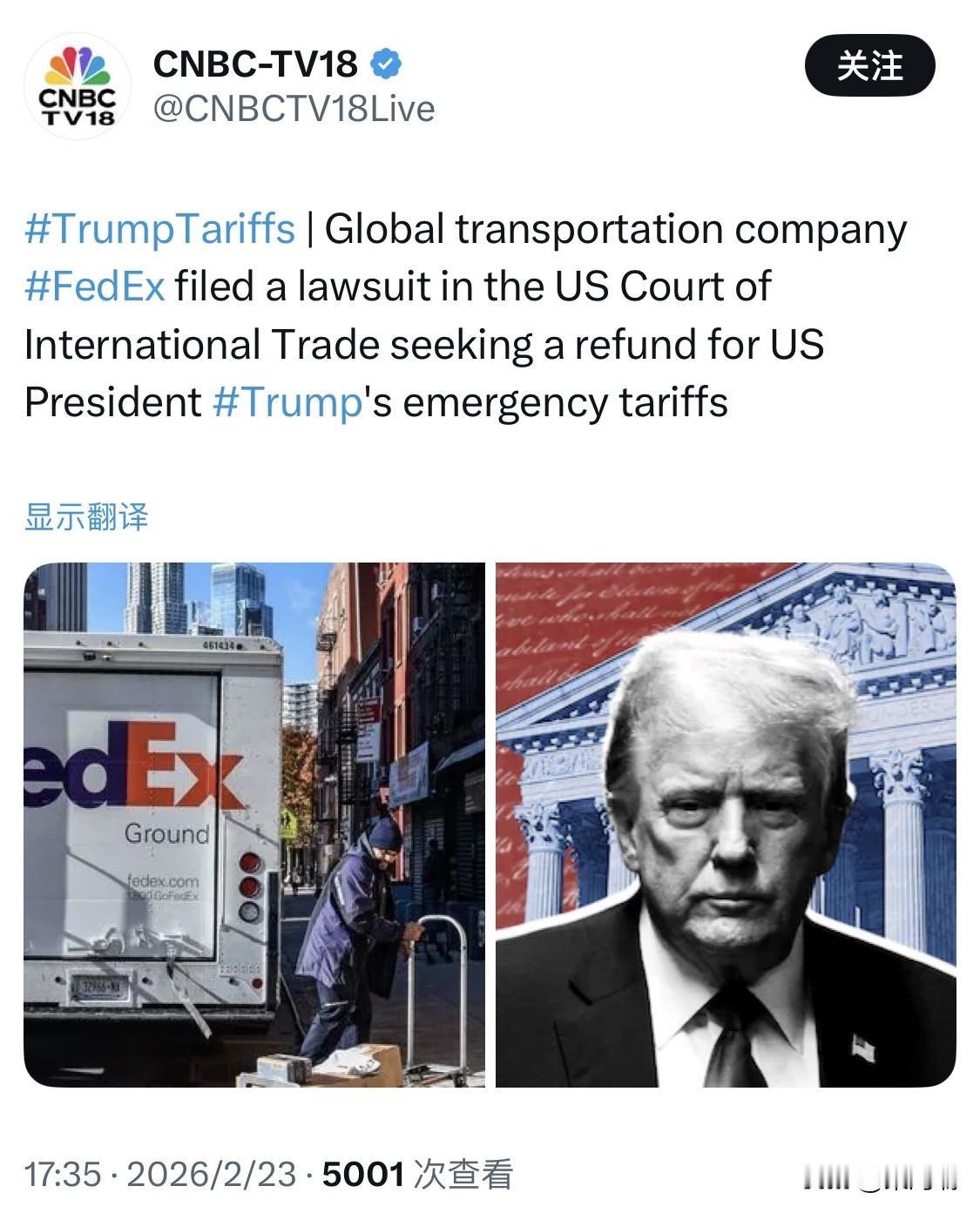 美国最高法院推翻川普总统的《国际紧急经济权力法》 IEEPA 关税后 ,联邦快递起诉美国政府:要求获得数十亿美元的纳税人资金作为“退款”。 联邦快递是最高法院裁决后第一家提起此类诉讼的大型公司,其法律行动标志着可能出现的数十亿美元退款潮的开始。 诉讼目标: 联邦快递在美国国际贸易法院(CIT)提起诉讼,要求“全额退还”其向美国政府缴纳的所有 IEEPA 关税。 起诉对象: 诉状列出的被告包括美国政府、美国海关及边境保护局(CBP)及其局长。 理由: 联邦快递表示,作为记录进口商,其在关税生效期间从受影响国家进口货物并支付了关税,由于最高法院已判定这些关税非法,公司有权获得赔偿。 退款金额: 联邦快递在诉状中未指明具体的索赔金额,但表示要求退还全部款项及利息。