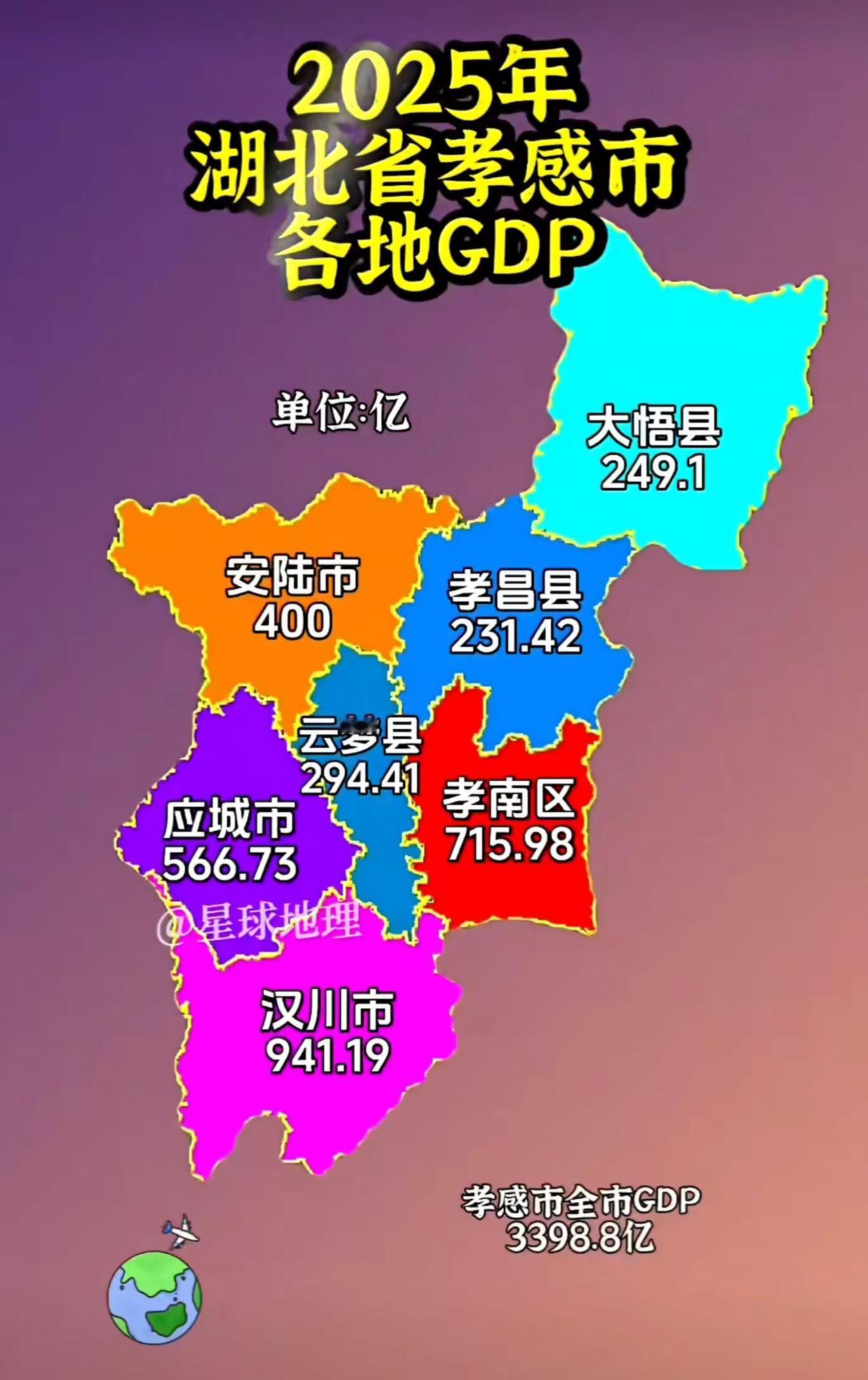 地图展示了2025年湖北省孝感市下辖7个县市区的GDP分布情况。从数据来看,汉川市以941.19亿元的GDP总量遥遥领先,是全市唯一的“千亿级”强县,其经济规模接近第二名孝南区的1.3倍,显示出极强的县域经济实力。孝南区(715.98亿元)和应城市(566.73亿元)紧随其后,构成了孝感经济的第二梯队。值得注意的是,安陆市(400亿元)和云梦县(294.41亿元)的经济总量也超过了200亿元,表现稳健。相比之下,大悟县(249.1亿元)和孝昌县(231.42亿元)的经济总量相对较小,处于全市的末尾梯队。整体来看,孝感市的经济呈现出明显的“南强北弱”格局。南部的汉川、孝南、应城等区县依托江汉平原的地理优势和靠近武汉的区位优势,经济发展水平较高;而北部的大悟、孝昌等山区县市,受限于地形和交通条件,经济发展相对滞后。全市GDP总量为3398.8亿元,汉川市一地的贡献占比接近28%,是拉动全市经济增长的核心引擎。