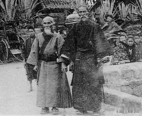 这张照片记录了琉球公使林世功(Rin Seikō,右侧蓄须者)及其随从的历史瞬间。1879年,日本实施“废藩置县”,正式吞并琉球。林世功曾前往清廷请求救援琉球,在求助无果后,他于1879年自尽以示抗议。 服饰特征 他们穿着典型的琉装(Ryusou),这是一种结合了中国与日本风格的琉球传统服饰。 羽织(Haori): 外层穿着类似日本传统夹克的短袍。 袴(Hakama): 下半身穿着宽大的褶皱裙裤。 发髻(Katashira): 尽管图像稍显模糊,但当时琉球士族通常会梳特有的发髻并插上金、银或铜制的发簪,以标识地位。