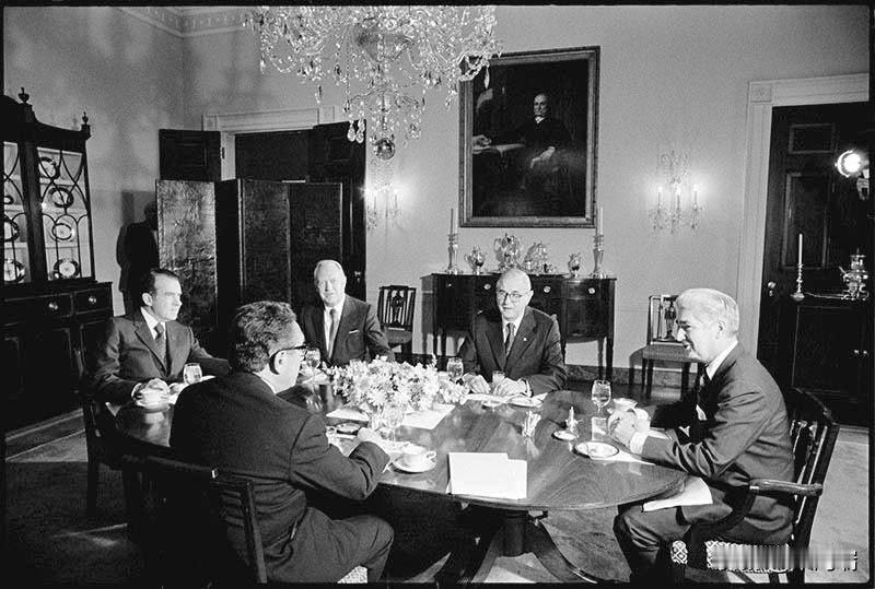 1973年2月23日——尼克松总统主持早餐会,与国务卿威廉·罗杰斯、助理国务卿威廉·沙利文、副国务卿威廉·波特和国家安全顾问亨利·基辛格博士讨论越南问题国际会议。