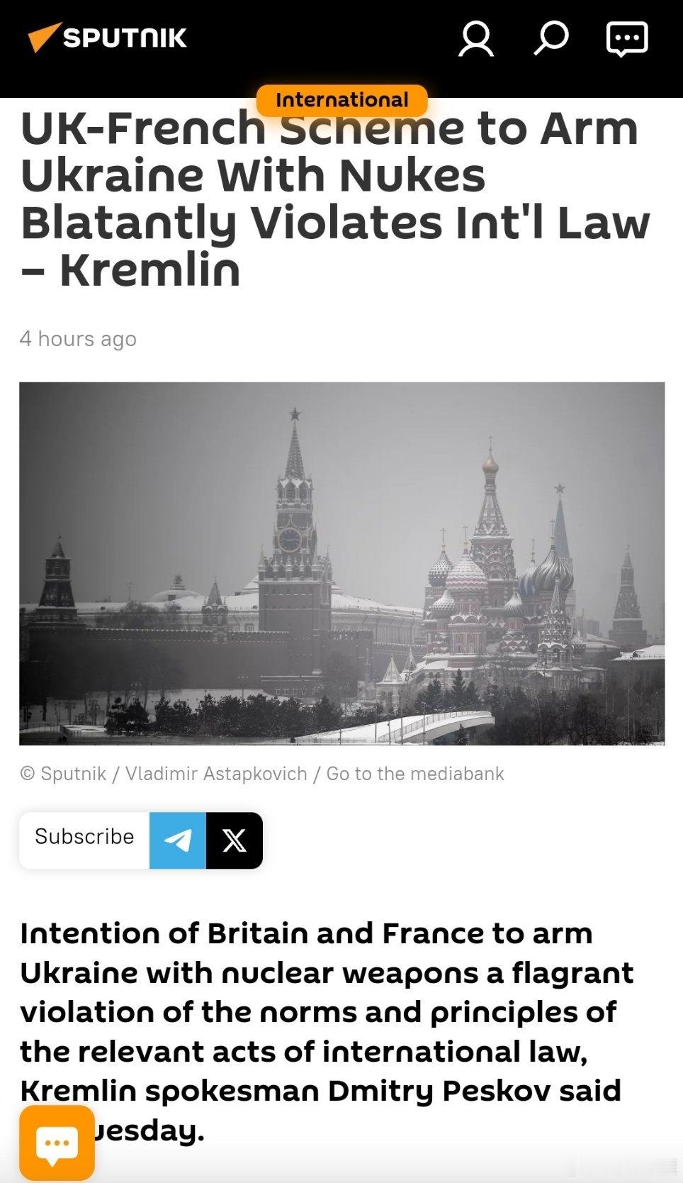 俄称英法准备向乌提供核弹英国与法国联手向乌克兰提供核武器的计划公然违反国际法——克里姆林宫表示