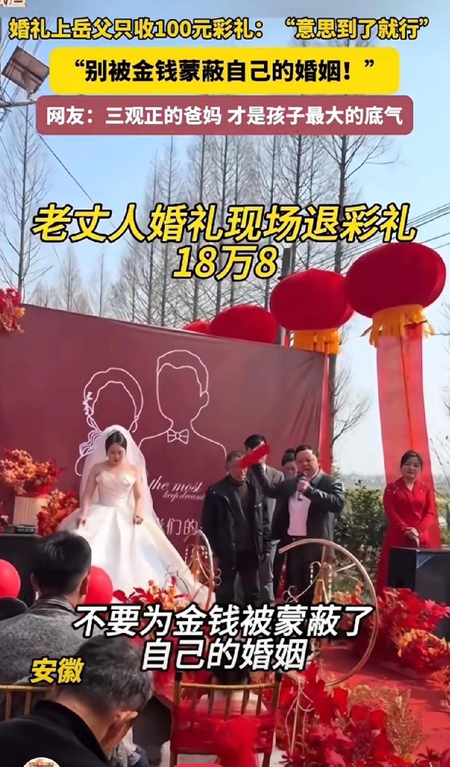 安徽一对新人结婚,老丈人退还188,000彩礼,仅仅只收100元,意思一下,他说,“别被金钱蒙蔽了自己的婚姻!” 评论区却炸开了锅: 有网友说,哈哈哈,我爸也干过这事8万8主动退2.8w,后来男的婚前就出轨了,他老人家估计傻眼了。 8.8万在我们那都已经是很低的了! 也有网友说,你不要的钱是他拿去娶下一个的资本。老婆生前辛辛苦苦打工赚钱,不顾身体,死后没多久转头又娶了个老婆,简直就是言听计从。 完der了 这一出儿男方家里肯定就觉得你好拿捏了 要么就别要别收 整这么一出 噗 自己受着吧! 对此,大家认为结婚该给彩礼吗? 彩礼 彩礼事情 家庭彩礼