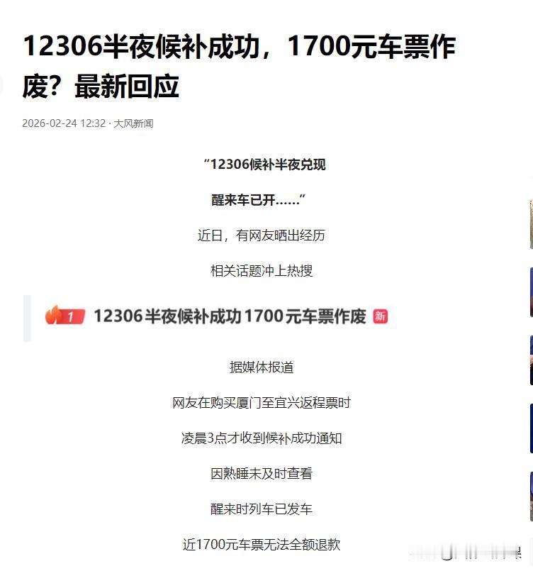 福建厦门,女子因买不到返程火车票,只能花1755元多买两站,但也只能等待候补票。可没想到,候补票在凌晨3点才成功取得,而女子睡过头了,等她醒来时,发现火车已经出发,无奈只得申请退票,但平台却告知没法退票,只能改签,费用为40%。女子气坏了,认为平台没有做好提醒义务,候补车票的退补规则也有问题。 据悉,女子原本是打算购买厦门到宜兴的火车票,但当她登陆12306平台准备购买时,发现2月23日那天只有候补票了。 为了增加抢票成功率,女子购买了多趟不同行程的候补票。可一直等到凌晨,女子都没等到候补成功的通知,她实在熬不住便睡着了。 结果在凌晨3点多的时候,系统发来信息说有一张上午8点50分的候补票抢票成功了。 但女子直到早上9点多才醒,等她打开手机查看时,发现8点50分的火车已经开走了,而其他的候补票都没有成功。 女子当时想着赶紧退票,希望能拿回大部分的车票,毕竟那张车票可是花了她1755块钱。 可系统那边的回复却是不能退票,只能改签,手续费是40%。 女子对此感到十分无语,这不就是让她自己承担差不多全额的车票损失吗? 女子认为12306的服务不行,都没有有效提醒功能。而且凌晨3点多通知抢票成功,这谁能知道? 当女子将此事分享到网上后,网友的意见也出现了分歧。有不少网友支持女子,认为12306的服务质量确实不行,应该在凌晨开启电话通知服务。 但也有网友认为,女子就是自己作的,平台提供了提醒功能,是你自己睡着了怪谁?平台只是为你一个人服务的? 其实这件事真的不能怪12306平台,抢候补票是在没有票的情况下,等待别人放弃行程而空出来的票。 那平台也不知道是哪位旅客在何时间段放弃行程,只能在拿到候补票的第一时间,去匹配需要的旅客。 难道平台还要识别旅客是否在睡觉,等旅客睡醒了再提醒,这明显是不现实的事情。 平台也无法识别旅客购买不同车次但差不多行程的候补票的目的,也无法在未经旅客授权的情况下,擅自帮旅客作出决定。 要知道12306平台面向的旅客是以千万为单位的,而春节前后的旅客数量可能达到上亿人次,不可能照顾得面面俱到,旅客对于候补票的管理应当自行操作。 《铁路旅客运输规程》第30条规定,因旅客自身原因不能按车票记载的时间、车次、车厢号、席别和席位号乘车,或者按照本规程规定被拒绝运输时,旅客要求办理退票或者改签的,应当按照铁路运输企业和旅客的约定办理。 本事件中,女子错过早上8点50分的火车,主要原因是她睡过头了。 其实她完全可以设置早上7点左右的闹钟,这样就能及时发现了,可她忘记设置闹钟了。 再说平台确确实实已经给女子发了短信提示,这在法律上已经算是尽到了提醒义务。不能因为女子的个人原因,就把责任全推给平台。大家都是成年人了,该是自己的责任就要认。 对于此事,您有什么看法?欢迎留言交流。