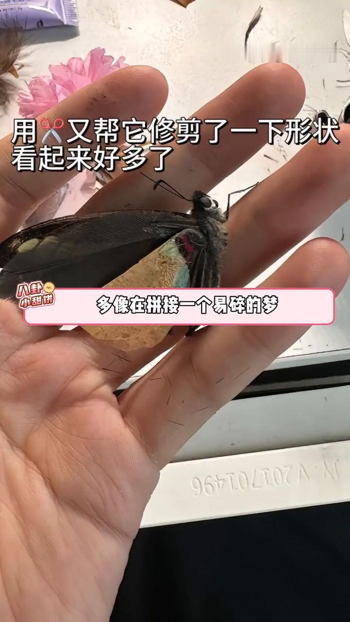 从那天开始,蝴蝶界就流传了一个传说,有一个神秘的仙人会为它们修补翅膀。故事的开始是一个博主遇到了一只断翼的蝴蝶,捡到一只翅膀残缺的蝴蝶好可怜,感觉已经奄奄一息了,整个右边的翅膀都全部断裂了,脚也少了两只触角也有一边不完整了,怎么才能帮助它?她轻轻棒起将它带回了家。 在了解到这种蝴蝶仅能存活不足一月时,她依旧选择了为它修补翅膀。用睫毛胶水帮它粘翅膀,这个过程真的太难了它一直乱动,很怕把它另一个翅膀也弄坏。翅膀的材料从枯叶到羽毛,捡了一些干树叶裁剪了蝴蝶翅膀的开,一次次比对,一遍遍修剪,多像在拼接一个易碎的梦。她想让这只蝴蝶至少能再感受一次风拂过翅膀的滋味。 那天在阳光下,博主用力的把蝴蝶往上一抛,空中蝴蝶带着新的翅膀缓缓展开身姿,而博主那双久久不愿放下的手成了空中精灵最坚强的后盾。给蝴蝶做翅膀简直是闻所未闻的事,值得吗?这只蝴蝶在乎的话就是值得的。
