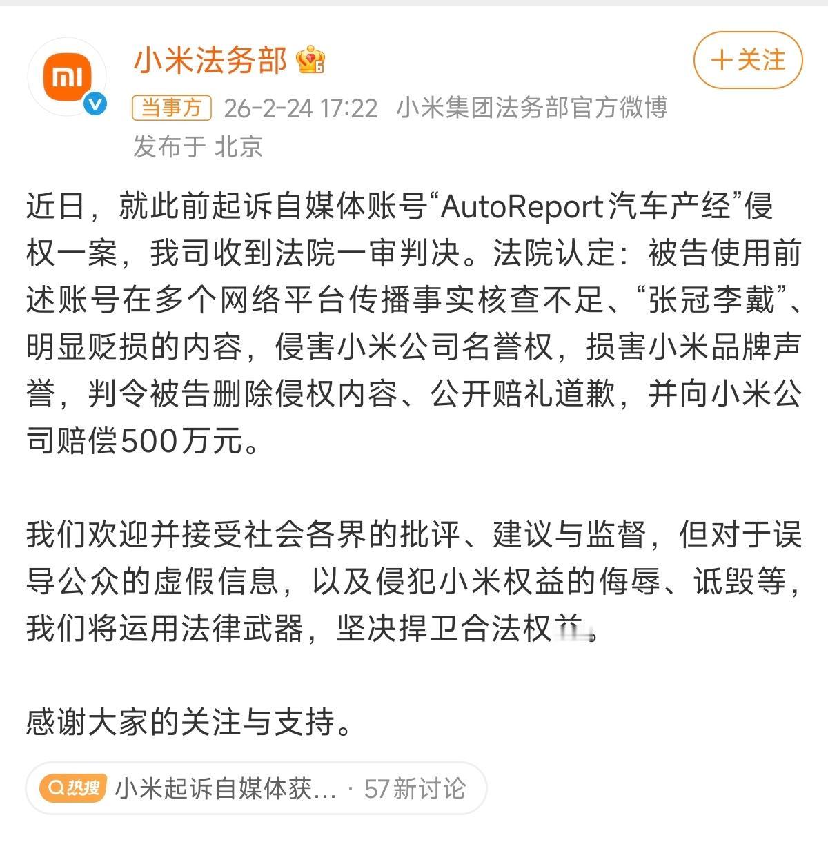 小米起诉AutoReport汽车产经侵权案一审判决:删除侵权内容、公开道歉、并赔偿500万,今年车企法务们会越来越硬。【来自懂车帝车友圈】