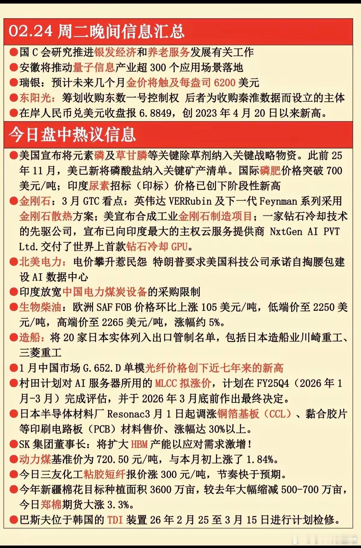 2.24周二 晚间 财经信息汇总!1.银发经济,养老经济2.量子科技3.磷化工4.金刚石散热5.电力,煤炭6.光纤涨价,创历史新高