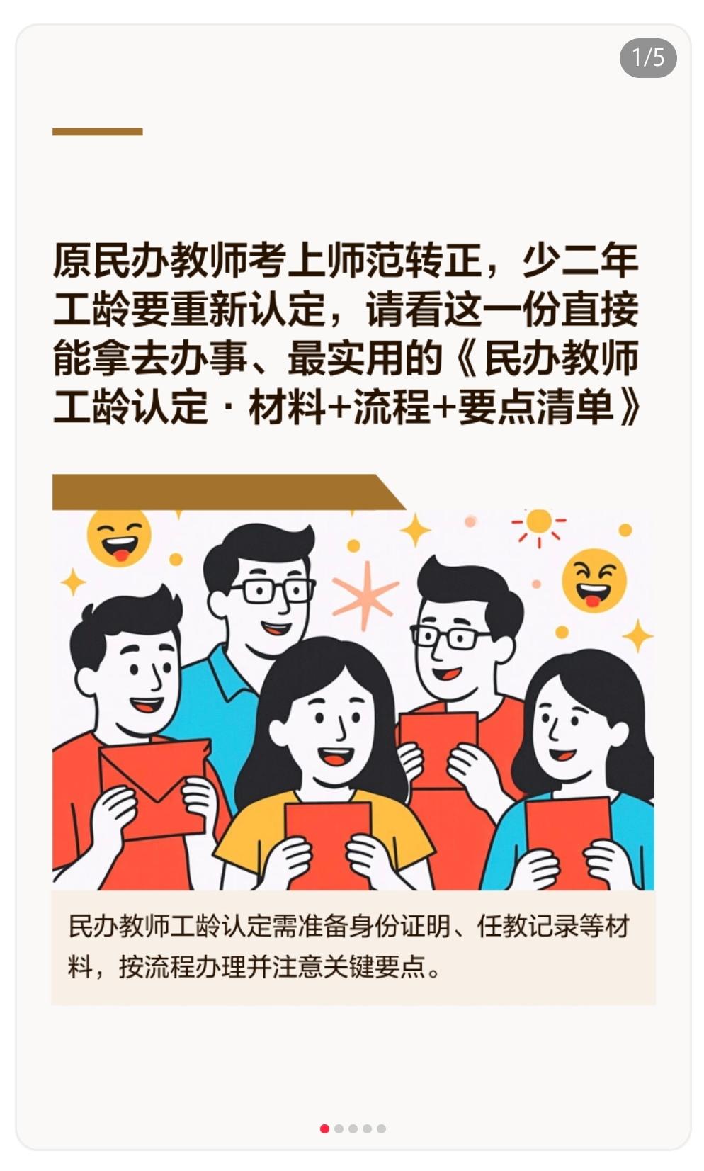 原民办教师考上师范转正少二年工龄重新认定,请看这一份直接能拿去办事、最实用的《民办教师工龄认定·材料+流程+要点清单》(按教人〔1991〕21号 + 各地通用口径整理) 一、你要先搞清楚:你符不符合认定条件 符合下面任意一条,才能用21号文认工龄: 1. 民办/代课教师 → 被招为正式教师/正式职工 2. 民办/代课 → 经组织批准上学(师范/进修等)→ 毕业后成为正式职工,继续从事教育工作 3. 在多个学校当过民办教师,经组织调动的,可合并计算 核心一句话: 最后一次经组织批准的民办教师时间,可以算连续工龄。 二、办理工龄认定必须准备的材料(按重要程度排) 1. 核心身份与任教证明(最关键) 民办教师/代课教师任用证、聘任证书、民办教师证 当年的教师花名册、民办教师登记表 学校或教育局出具的任教起止时间证明 写明:何年何月至何年何月、在何学校、任民办/代课教师 2. 证明“经组织批准”的材料 调动介绍信、工作介绍信 经批准进修、上学的录取通知、组织推荐材料、学籍证明 没有原件的,可用档案里的相关记载页复印件(加盖档案章) 3. 转为正式职工的证明 招工表、录用审批表、转正定级表 事业单位聘用合同、入编证明 工资变动审批表(能体现连续工龄) 4. 档案与个人材料 身份证、户口本 个人档案托管证明 退休审批表(如正在办退休) 5. 没有原件怎么办? 去这几个地方找: 原任教学校 乡镇中心校/教管办 县/区教育局人事股 档案馆(查当年民办教师文件、名册) 找不到原始材料,一般不认,一定要尽量找到。 三、办理流程(一步一步照着走) 1. 先到教育局人事股/股室领表: 《民办教师工龄认定申请表》《连续工龄审批表》 2. 找原学校 + 中心校盖章,证明任教经历 3. 把所有材料交教育局人事部门初审 4. 教育局审核后,送人社局(工资福利股/养老股)审批 5. 审批通过 → 存入档案 → 工龄正式认定 6. 办退休/算社保时,直接按认定后工龄计算 四、最容易卡壳的3个关键点(一定要注意) 1. 只认“最后一次”民办教师时间 中间断过、后来又回去当民办,一般只算最后一段。 2. 必须“继续从事教育工作” 转去其他行业,通常不能按21号文认。 3. 必须“经组织批准” 自己离职、自己上学、自己跳槽,一般不算。农村老民办教师 原民代课老师
